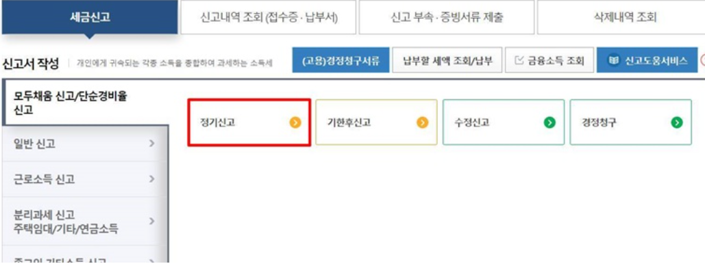 세금 신고 -> 정기 신고 -> 모두채움 신고/단순경비율신고 -> 정기신고 클릭