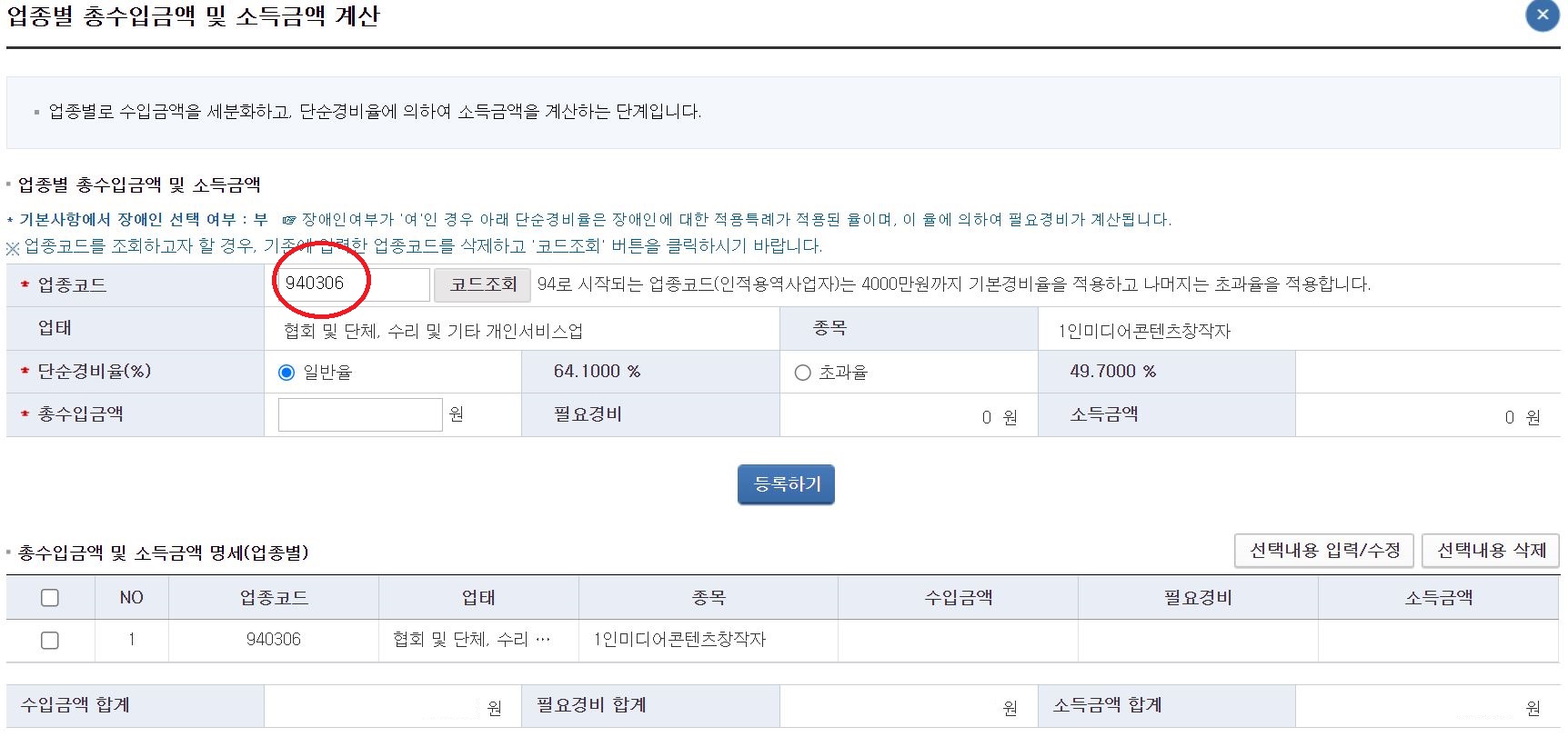 사업자등록번호 없음, 주업종코드 940306 입력 후 등록