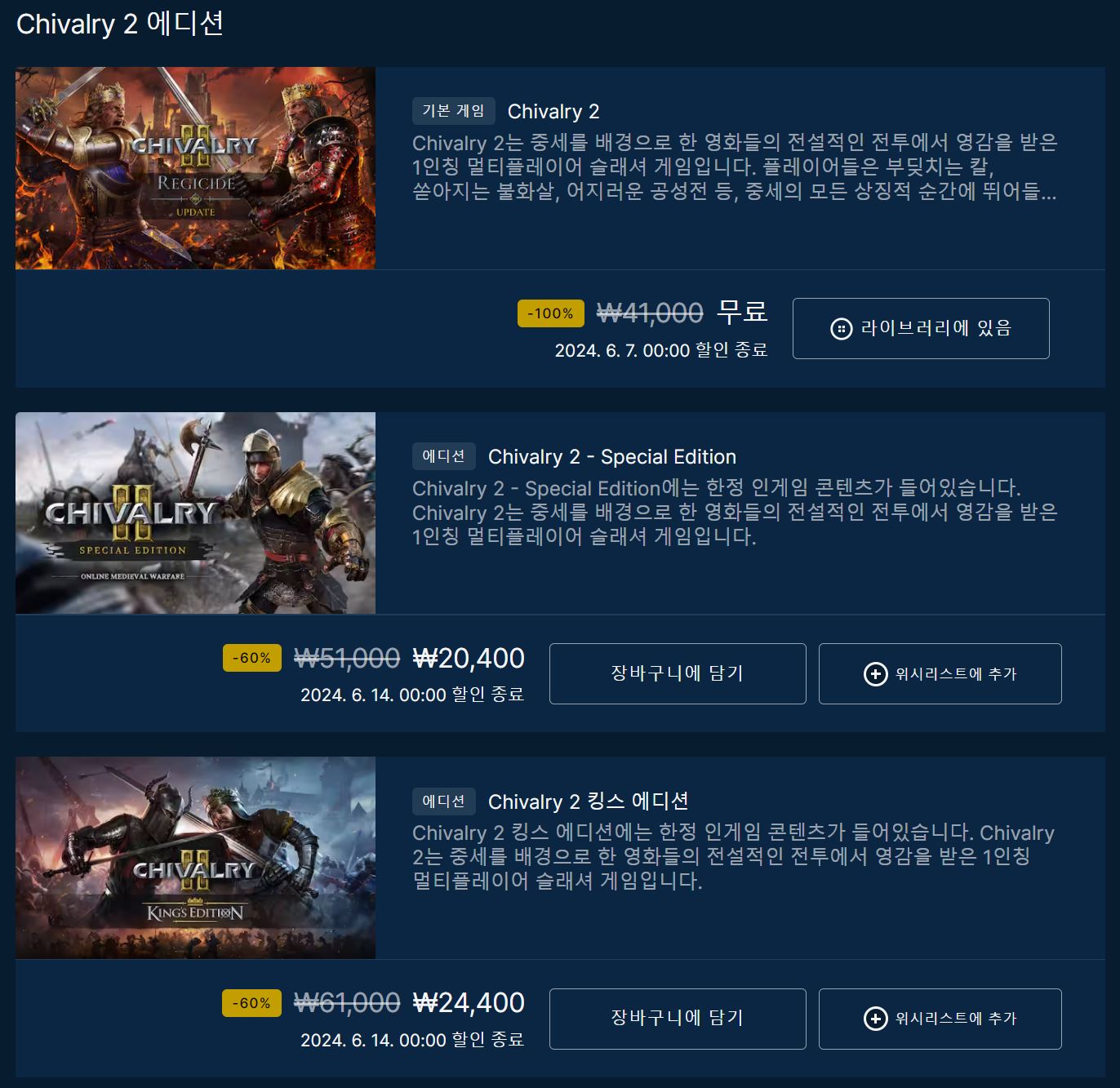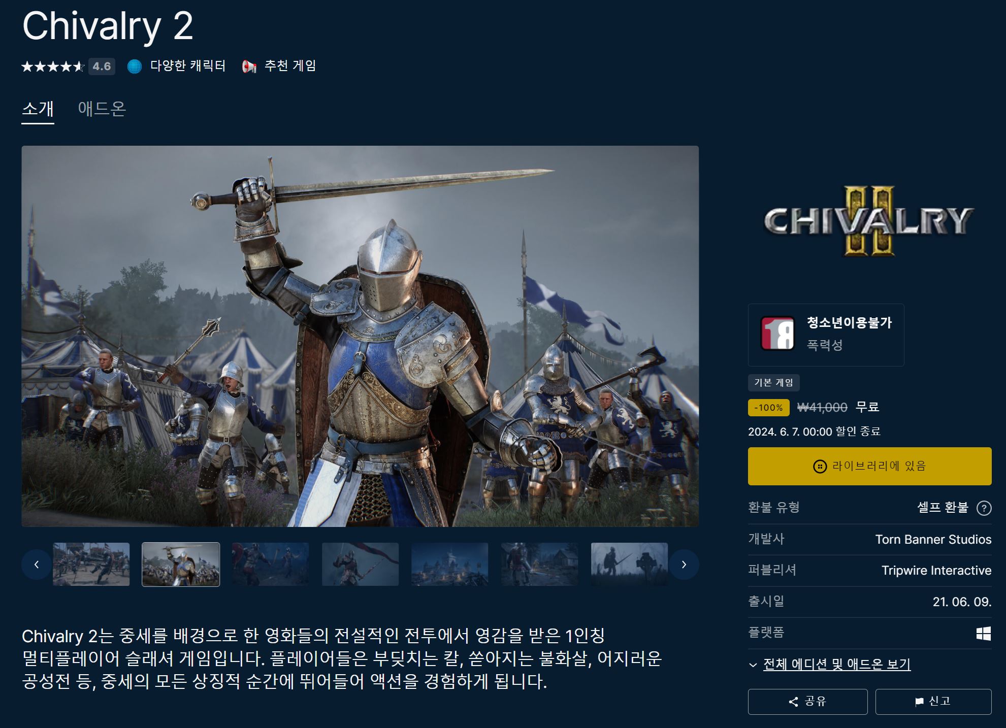 이번주 무료 게임은 Chivalry2 입니다.