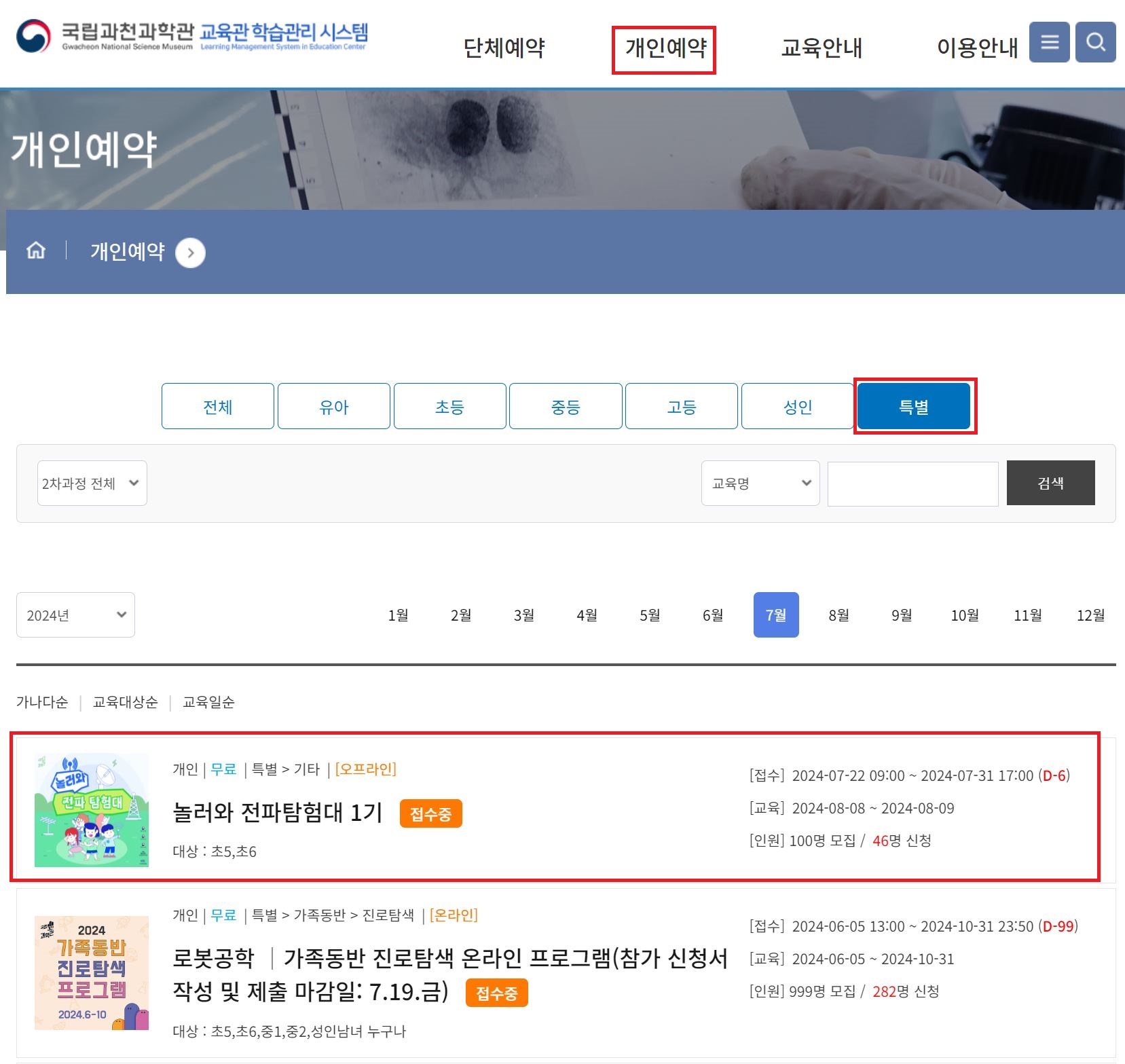 로그인 후 개인 - 특별에서 신청