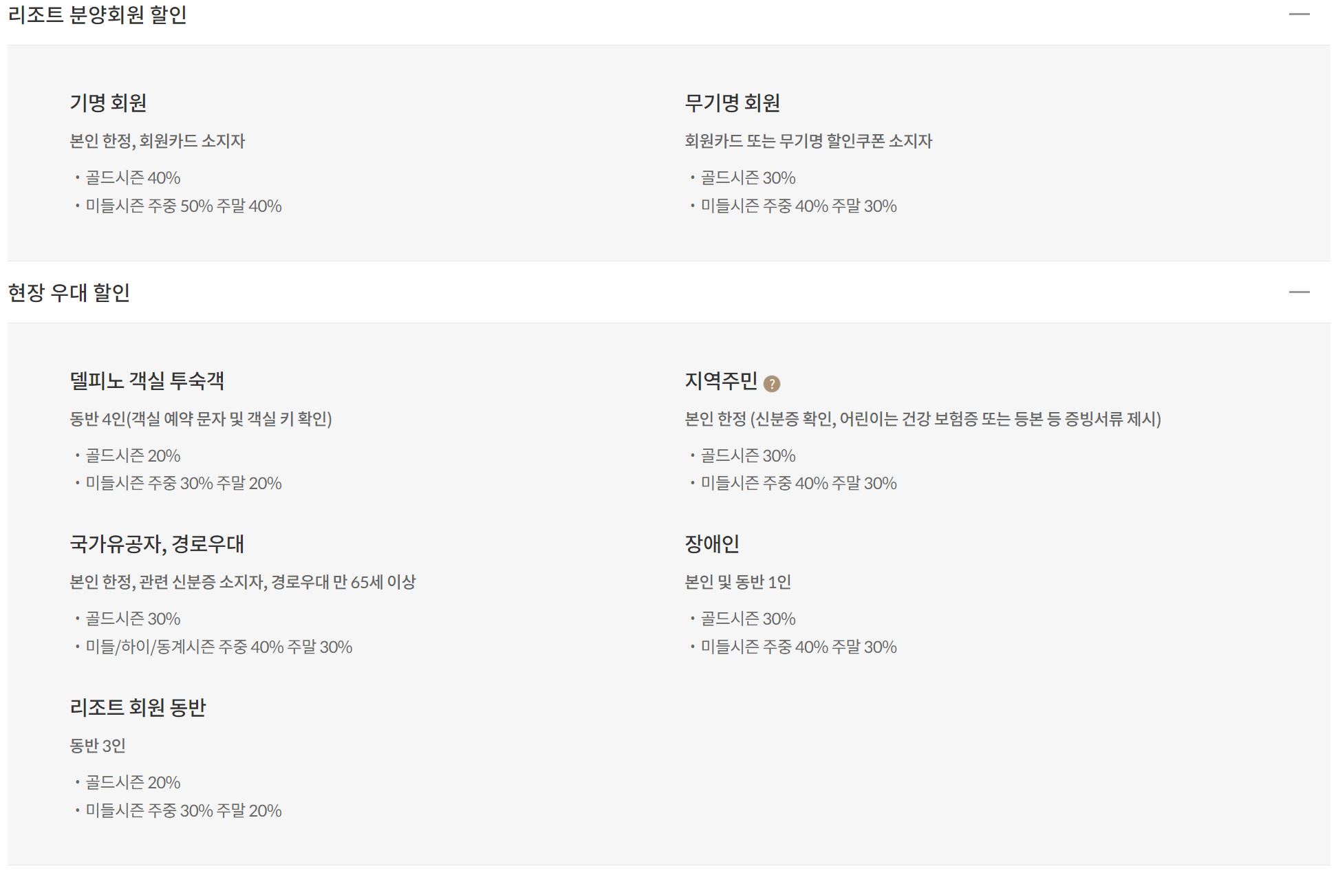 할인 요금을 살펴보니 리조트 분양회원이나, 투숙객은 할인받을 수 있습니다.