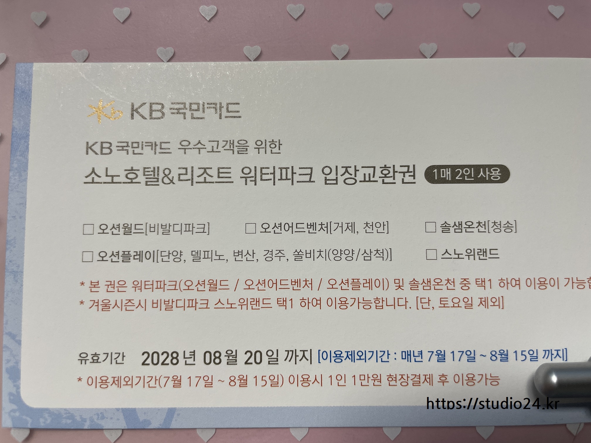 2가지 방법 중 제가 자주 이용하는 KB국민카드 워터파크 입장교환권을 사용합니다.