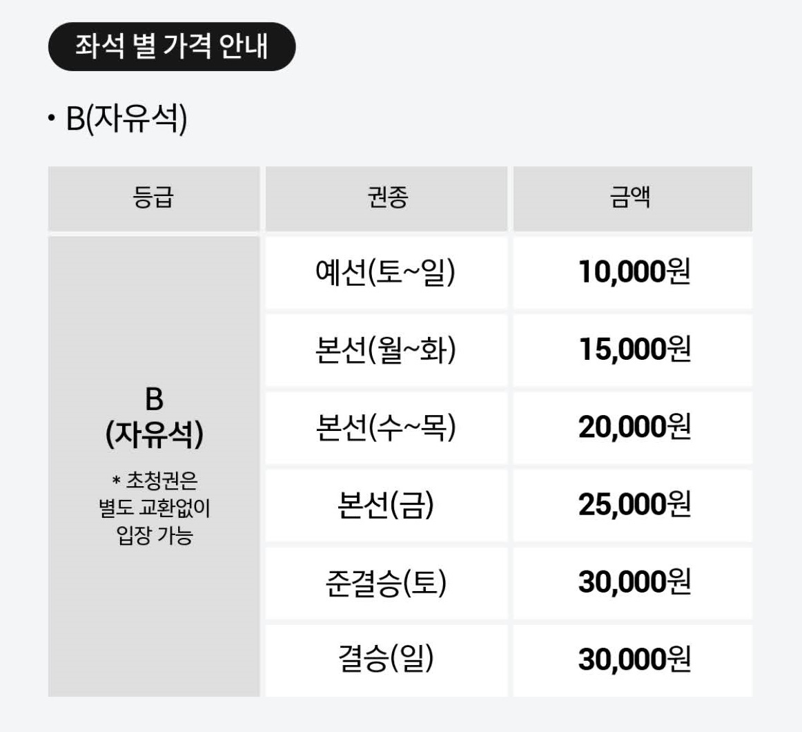 (자유석의 경우 본선 8강까지 작년 대비 5천원의 가격 인상이 있습니다.)