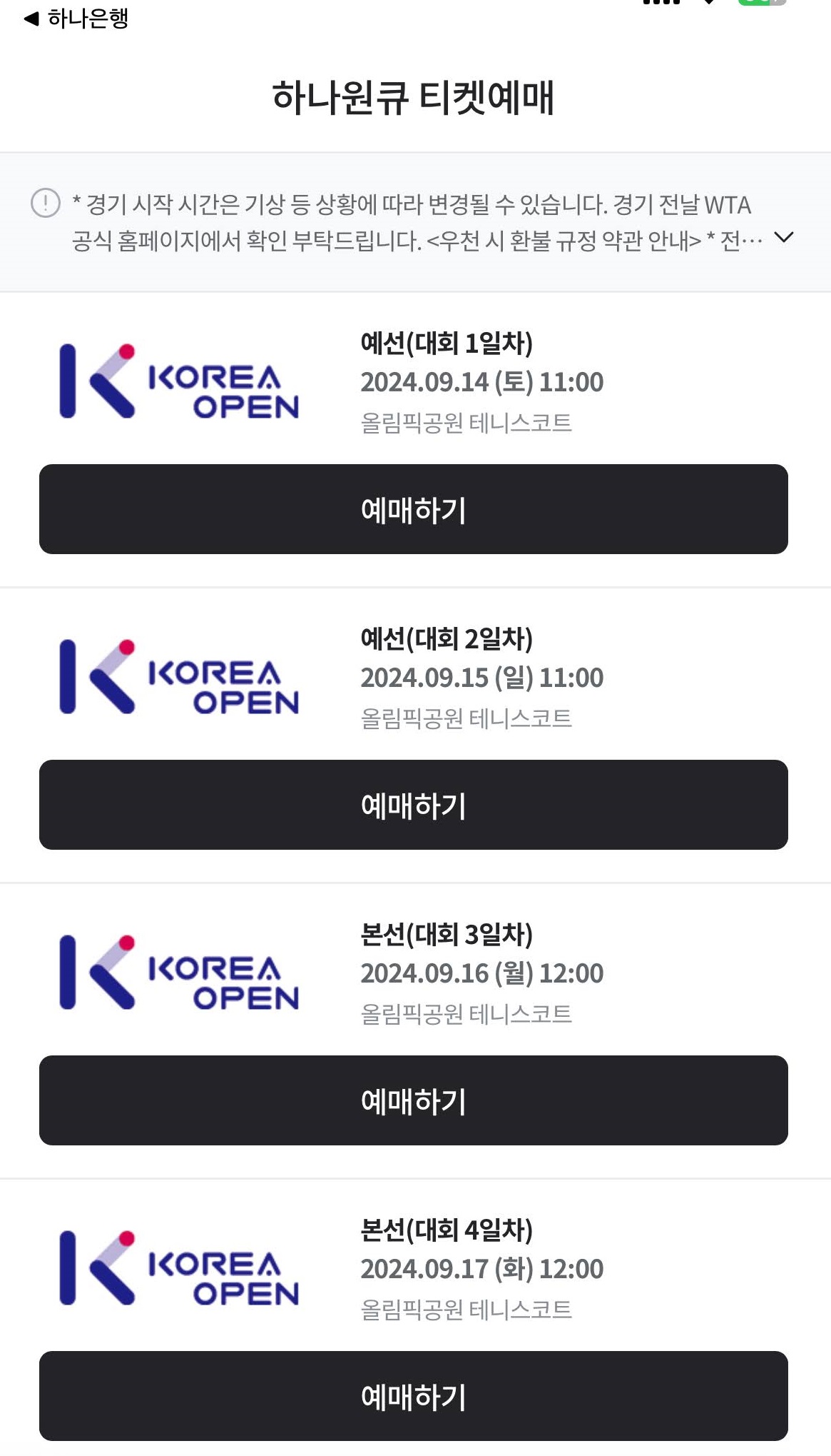 코리아 오픈 2024 티켓 예매가 진행되었습니다.