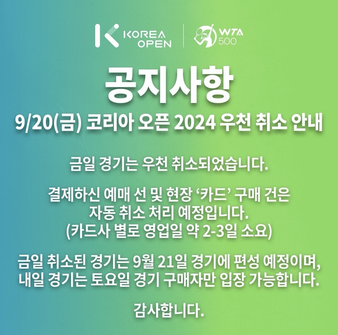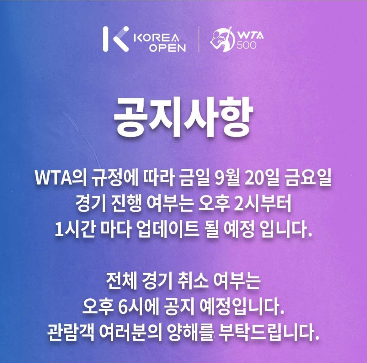 경기 진행 여부는 KOREA OPEN 조직 위원회의 결정이 아닌 WTA 규정에 따라 진행됩니다.
