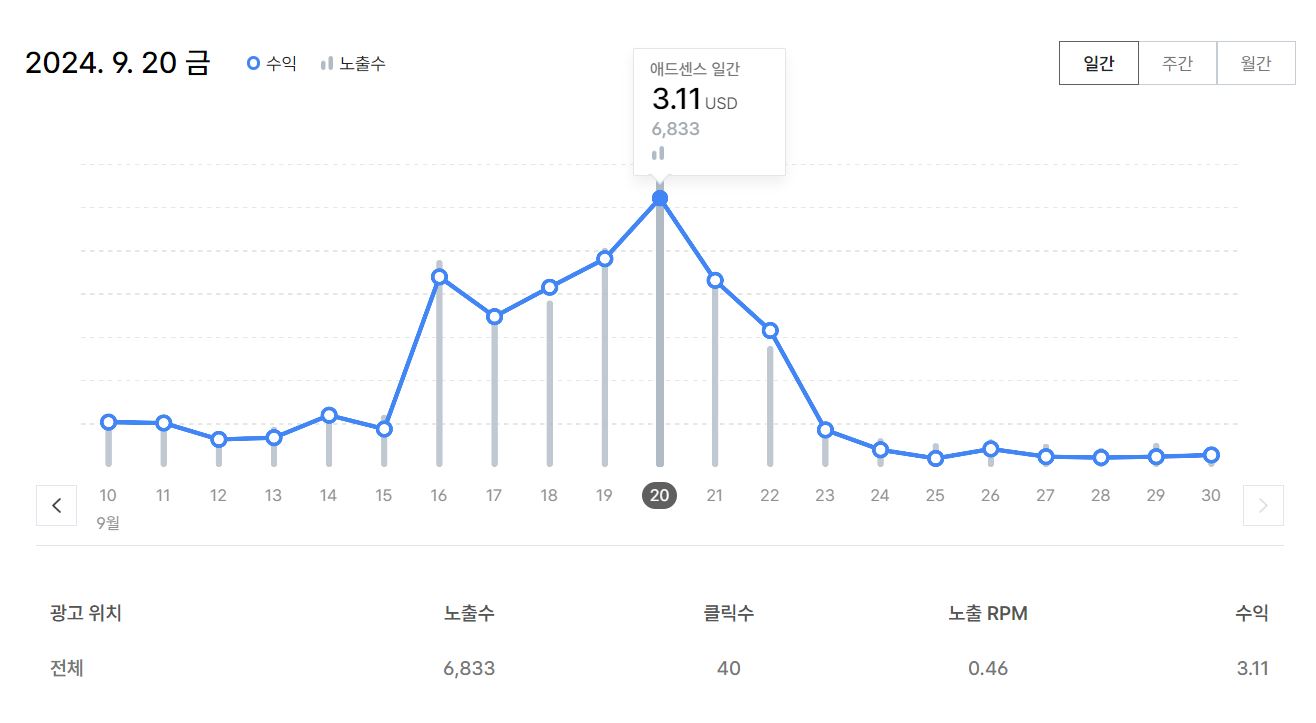 일 1달러, 월 30달러는 평균 수익으로 가져왔던 티스토리 블로그가, 하루 0.3 달러로 급감했어요.