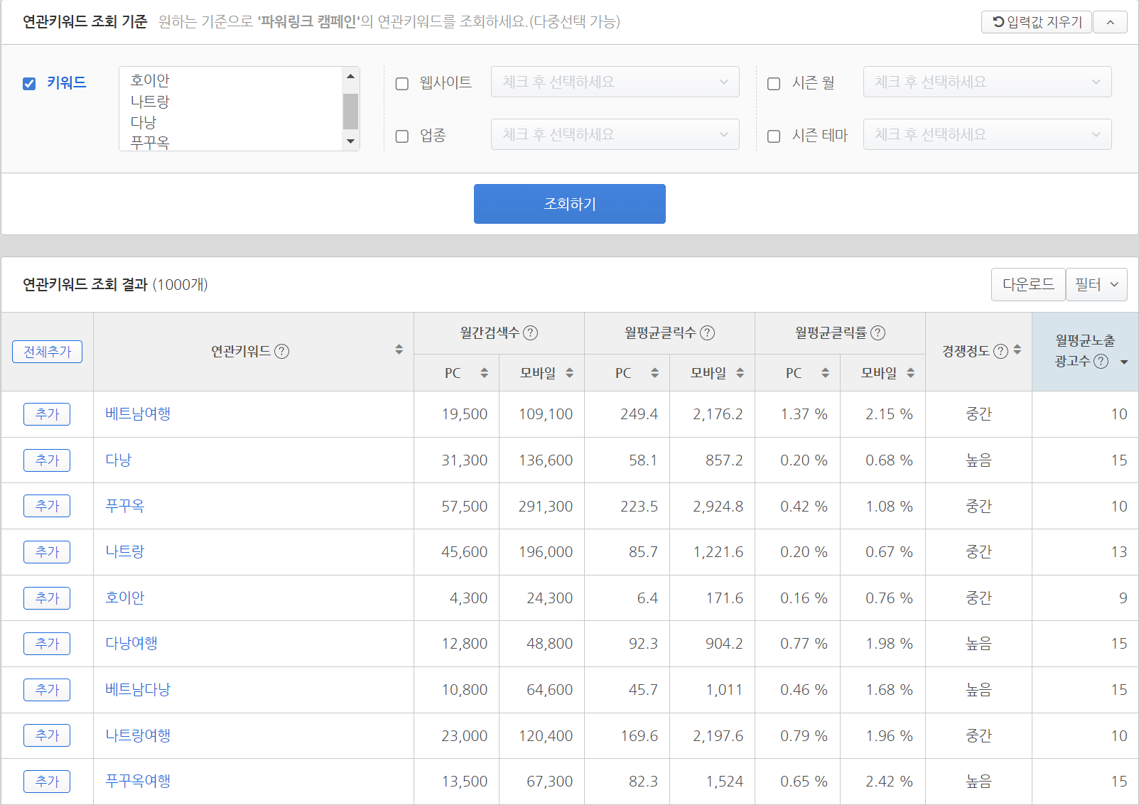 그럼 베트남 여행과 관련된 키워드를 넣어 보겠습니다.