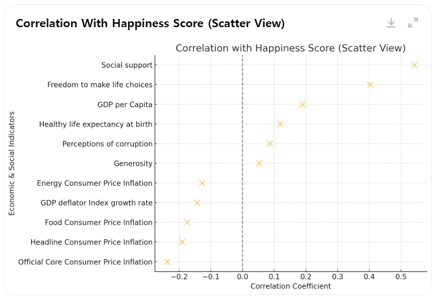 세계 데이터를 분석해 보면, 행복 점수와 가장 강한 상관관계를 보이는 요소는 다음과 같습니다.
