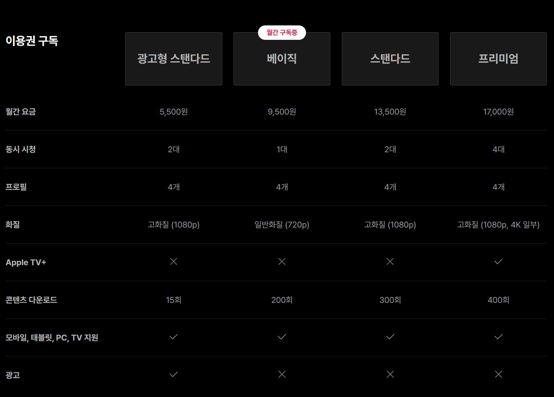 베이직 상품보다 동시 시청이 2대로 늘어났고, 고화질 감상이 가능한 장점이 있습니다.