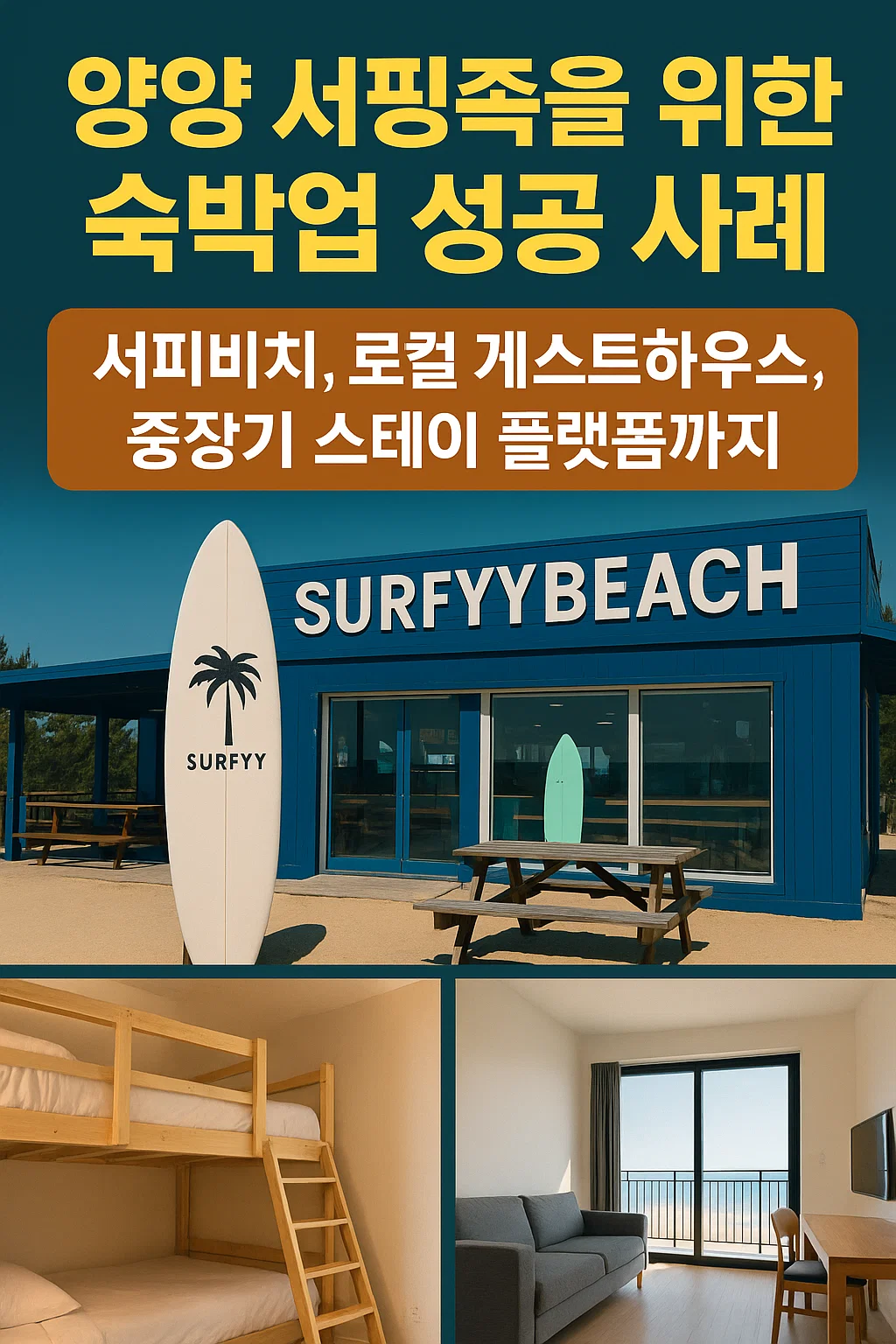 - 대표 성공 사례: 라온서피리조트(서피비치), 인구해변 게스트하우스·서핑샵, 중장기 스테이 플랫폼 ‘미스터멘션’