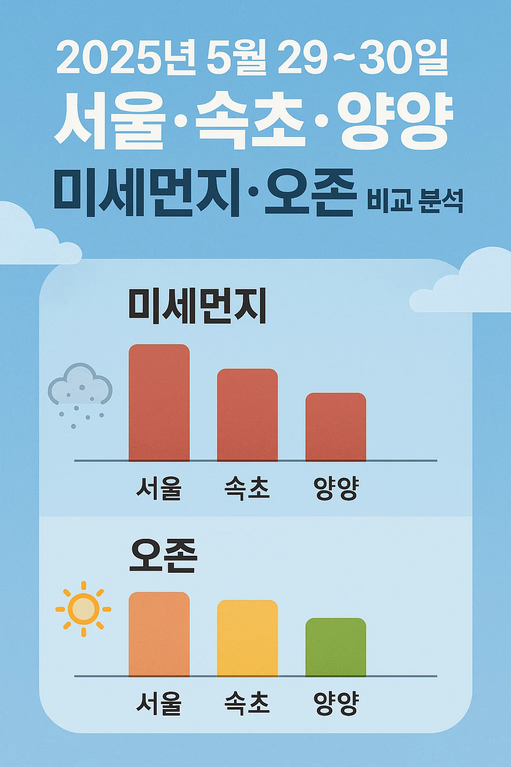 2025년 5월 29일과 30일을 기준으로 서울, 속초, 양양 지역의 미세먼지(PM10, PM2.5)와 오존(O₃) 수치를 비교 분석하고, 최근 오존 주의보 발령 증가와 건강관리 팁까지 꼼꼼히 정리합니다.