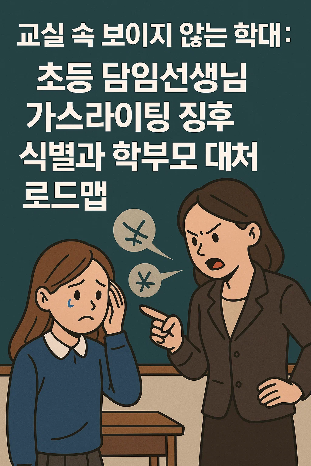 - 조기 징후: 아이가 “선생님이 늘 내가 이상하대” “엄마 아빠에게 말하면 더 혼난대” 등 특정 문구를 반복 보고. 수업 참여 기피, 위축, 복통·두통 같은 신체화 증상 동반 가능. (슬로우뉴스, 정치하는엄마들)