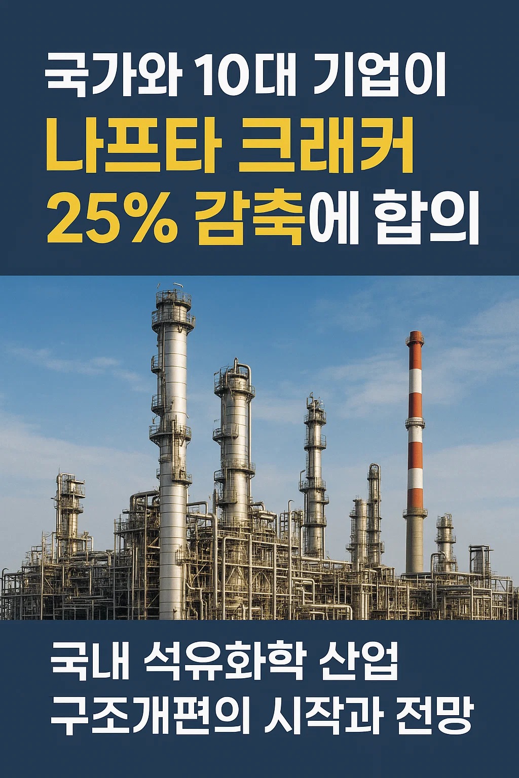 2025년 8월, 정부와 국내 10대 석유화학 기업(LG화학, 롯데케미칼, SK지오센트릭, 한화토탈 등)이 위기 극복을 위해 270~370만 톤 규모, 즉 전체의 18~25%에 달하는 나프타 크래커(NCC) 생산능력 감축에 합의하면서 국내 석유화학 구조조정이 본격적으로 가동되고 있습니다.
