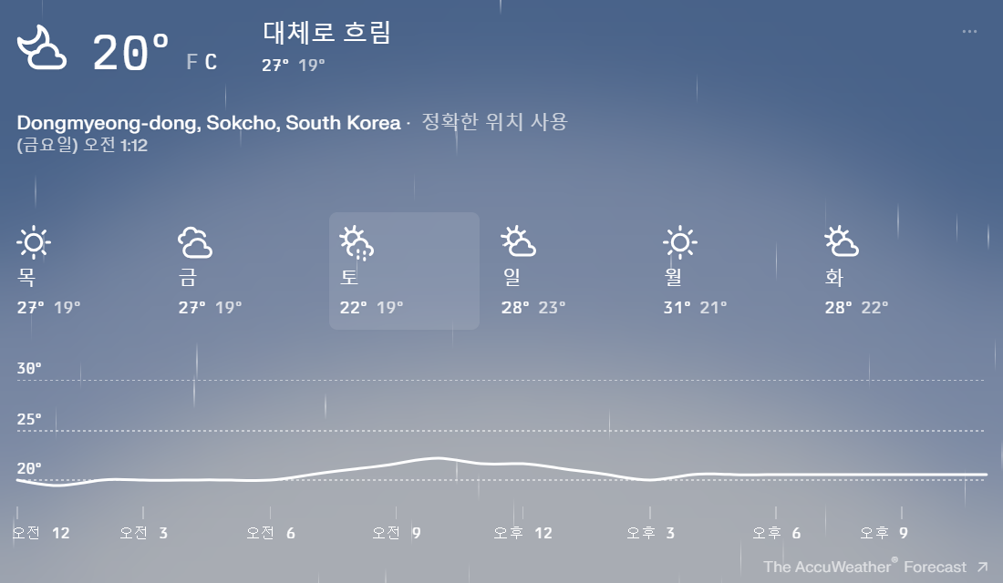 강원도 속초는 9월 12일 금요일 전국적으로 흐리고 구름 많은 날씨에 이어 오후부터 비가 내리기 시작, 밤에는 돌풍과 천둥번개를 수반하는 강한 비가 예고되고 있습니다.