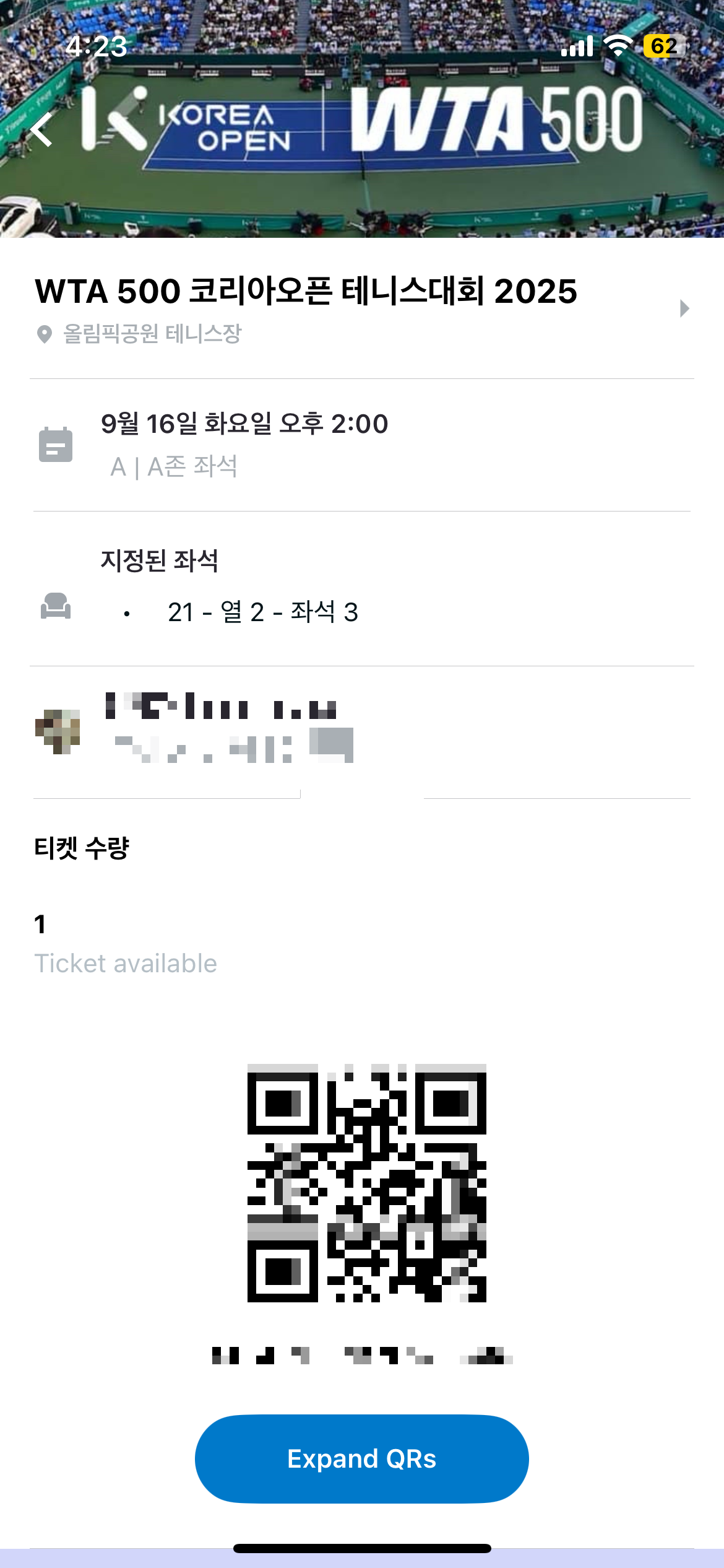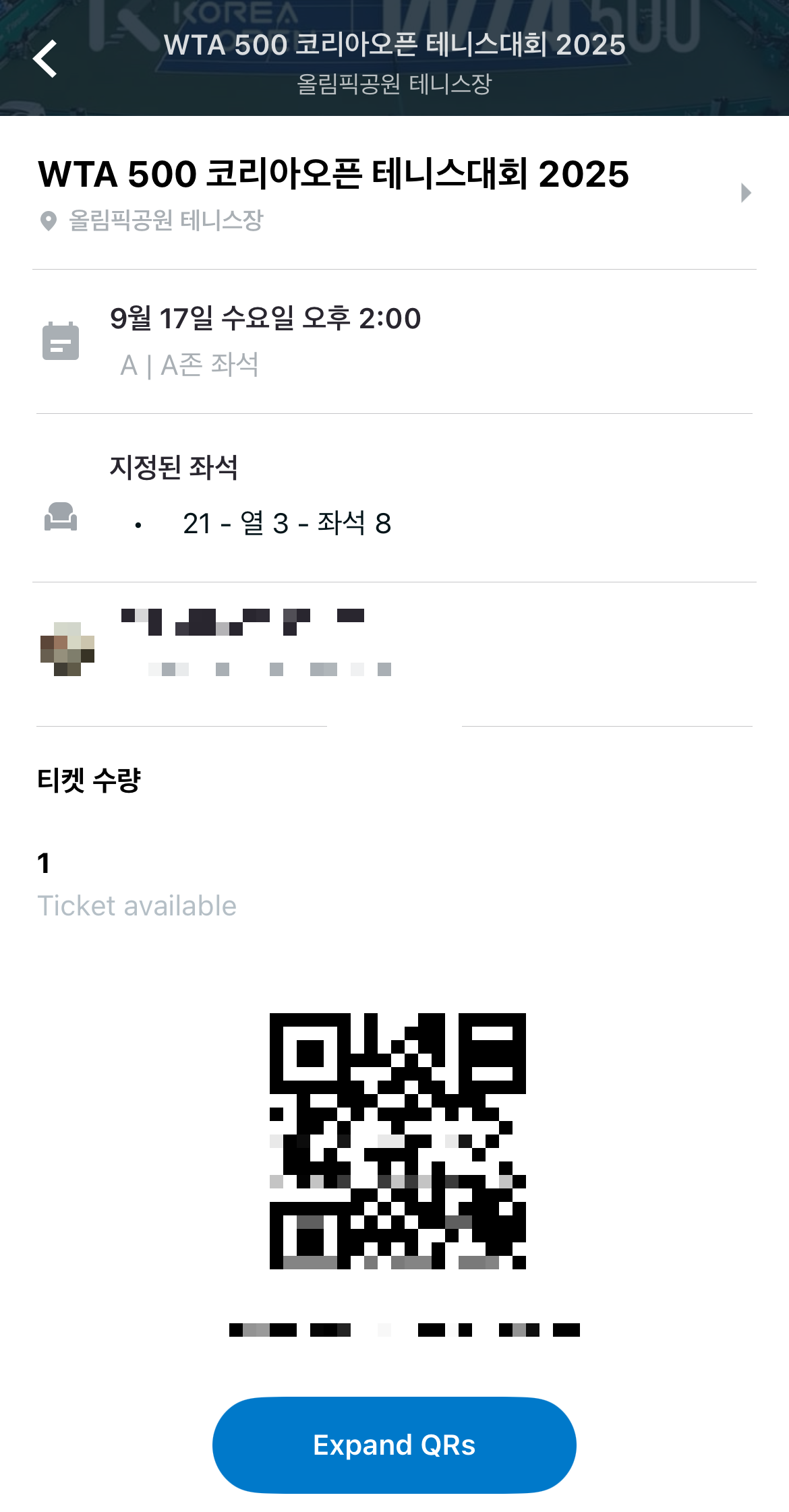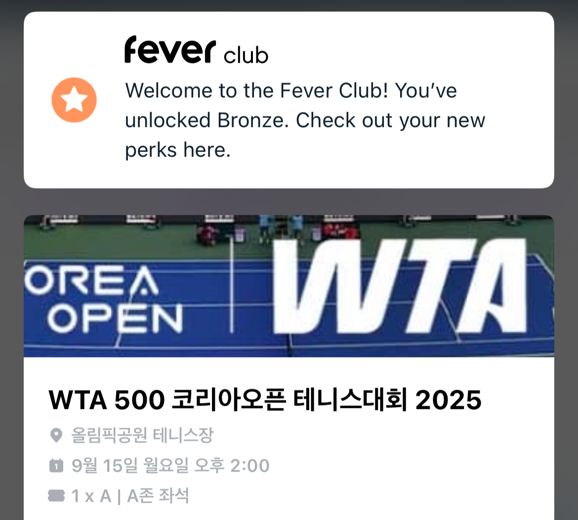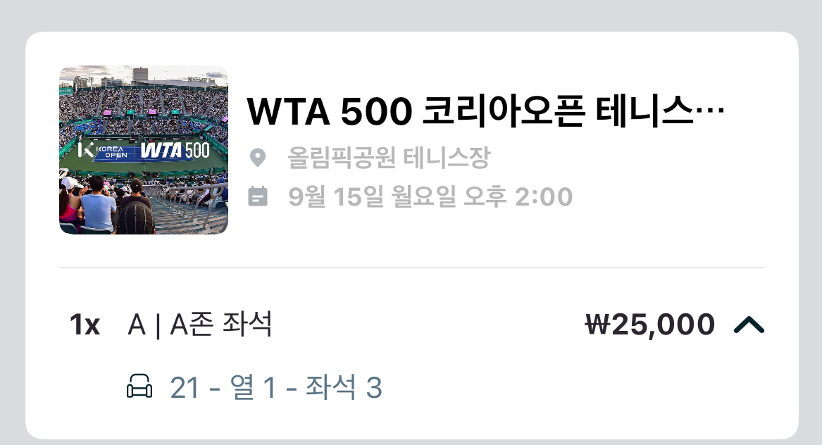 코리아 오픈 2025 테니스 대회 티켓 예매가 진행되어 구입했습니다.