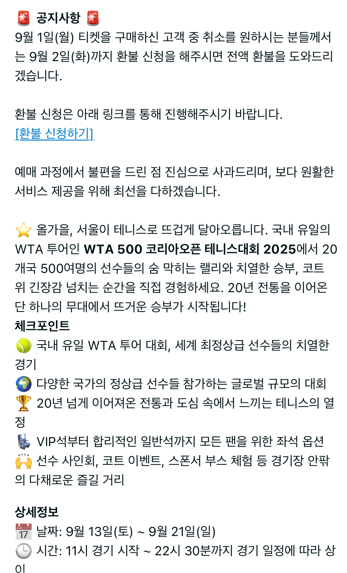 | 테니스, WTA500 2025 코리아 오픈 19일 우천 공지 (0) | 2025.09.19 |