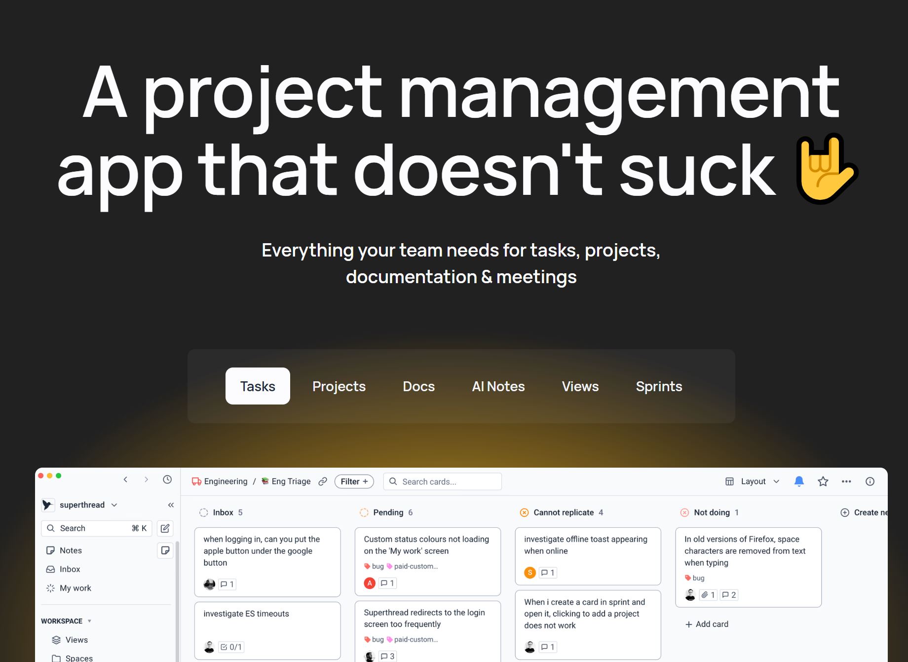 A project management app that doesn't suck 🤟 Everything your team needs to collaborate on tasks, docs & meetings.