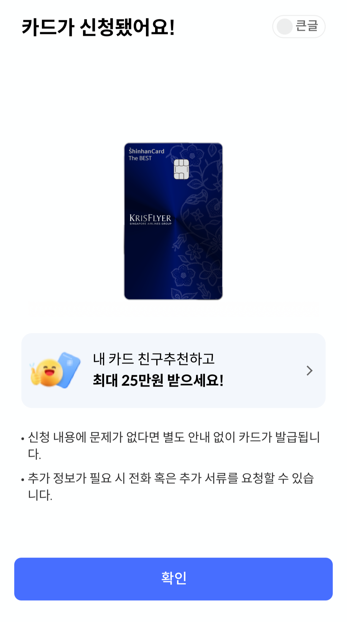 정보값을 입력하면 항공사에서 확인 후 승인을 눌러야 카드 발급이 된다고 합니다.