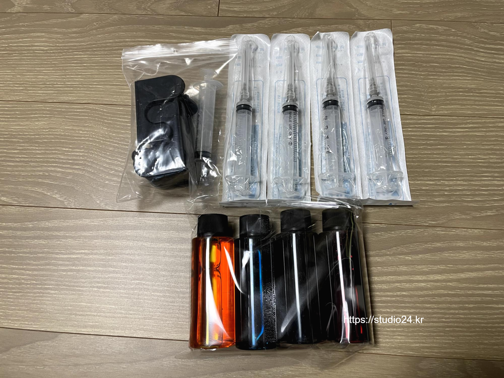 4가지 색상과 주사기 4종이 세트로 왔습니다.