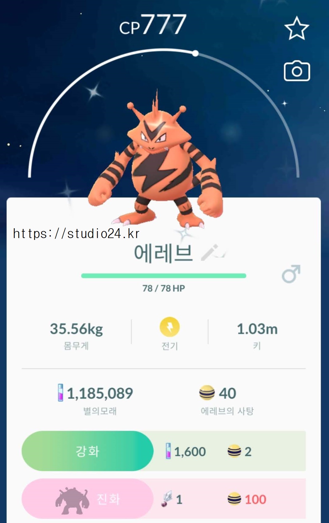 너무 많이 에레브를 잡아서 친구 교환 했더니 반짝반짝 포켓몬이 되었어요.