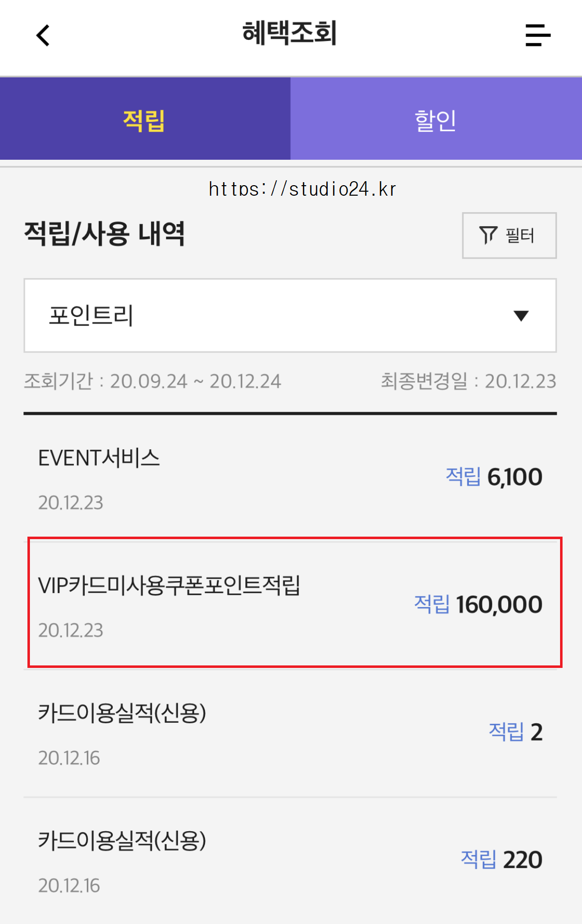 VIP 카드 미사용 쿠폰 포인트 적립 16만 포인트