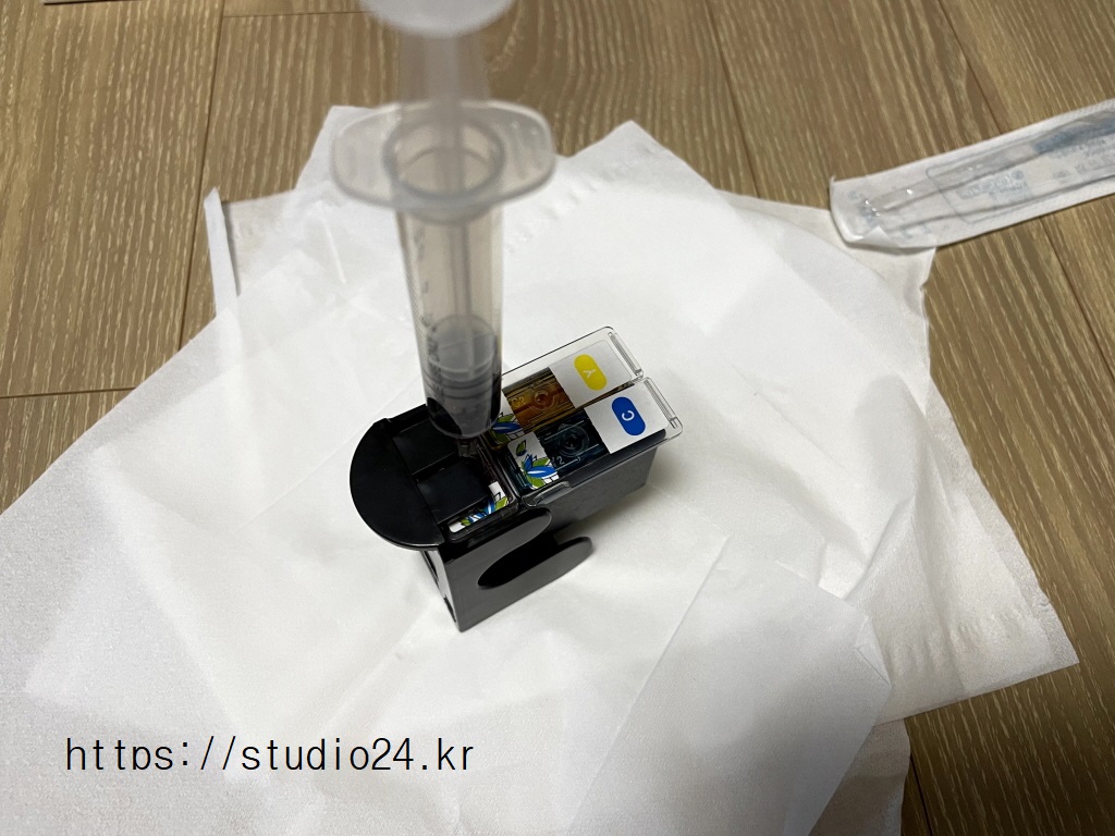 3가지 색상의 잉크를 주사기로 주입했어요.