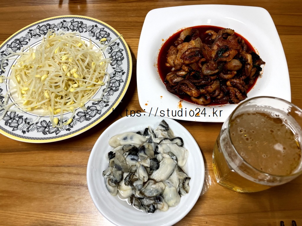 쭈꾸미 볶음과 콩나물 그리고 맛있는 생굴과 함께하는 맥주 한잔~