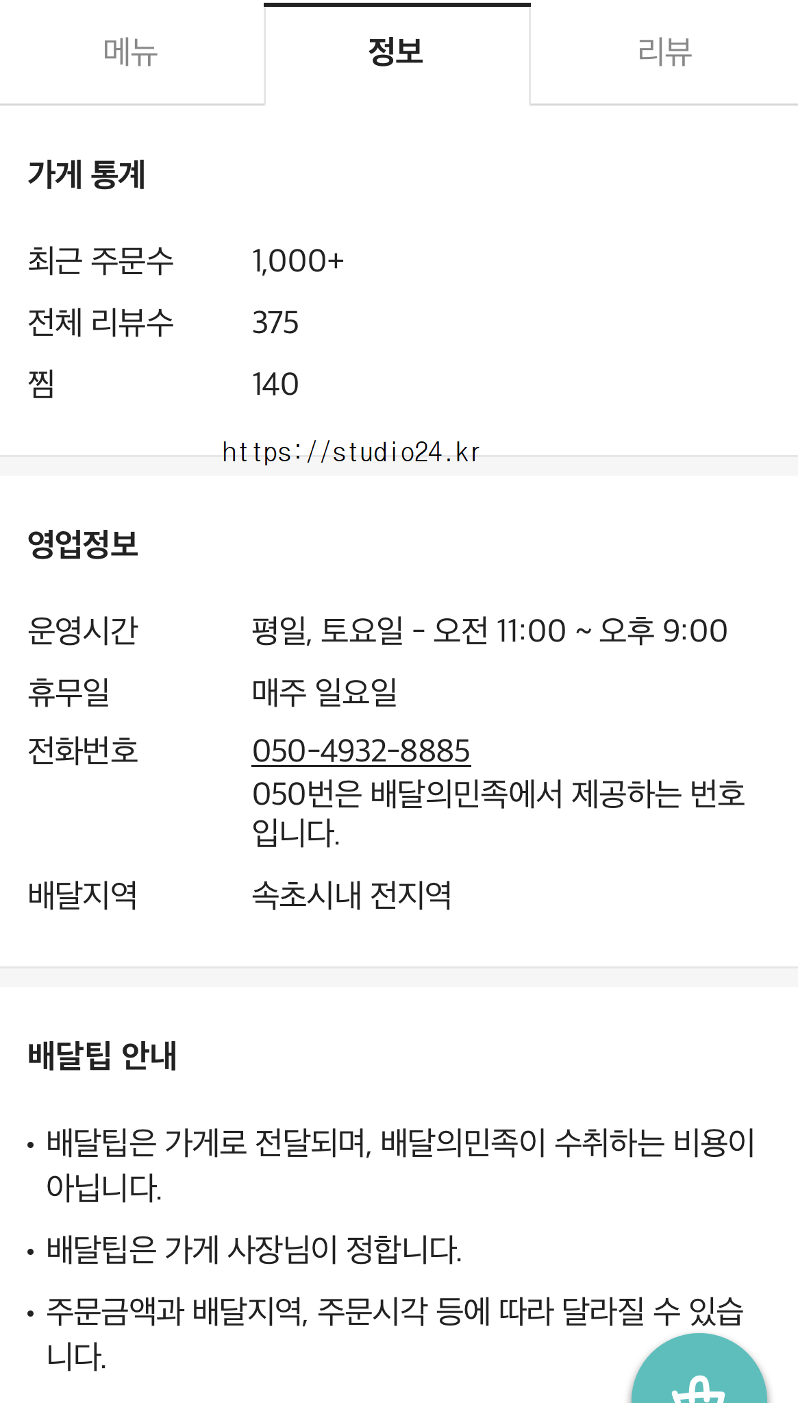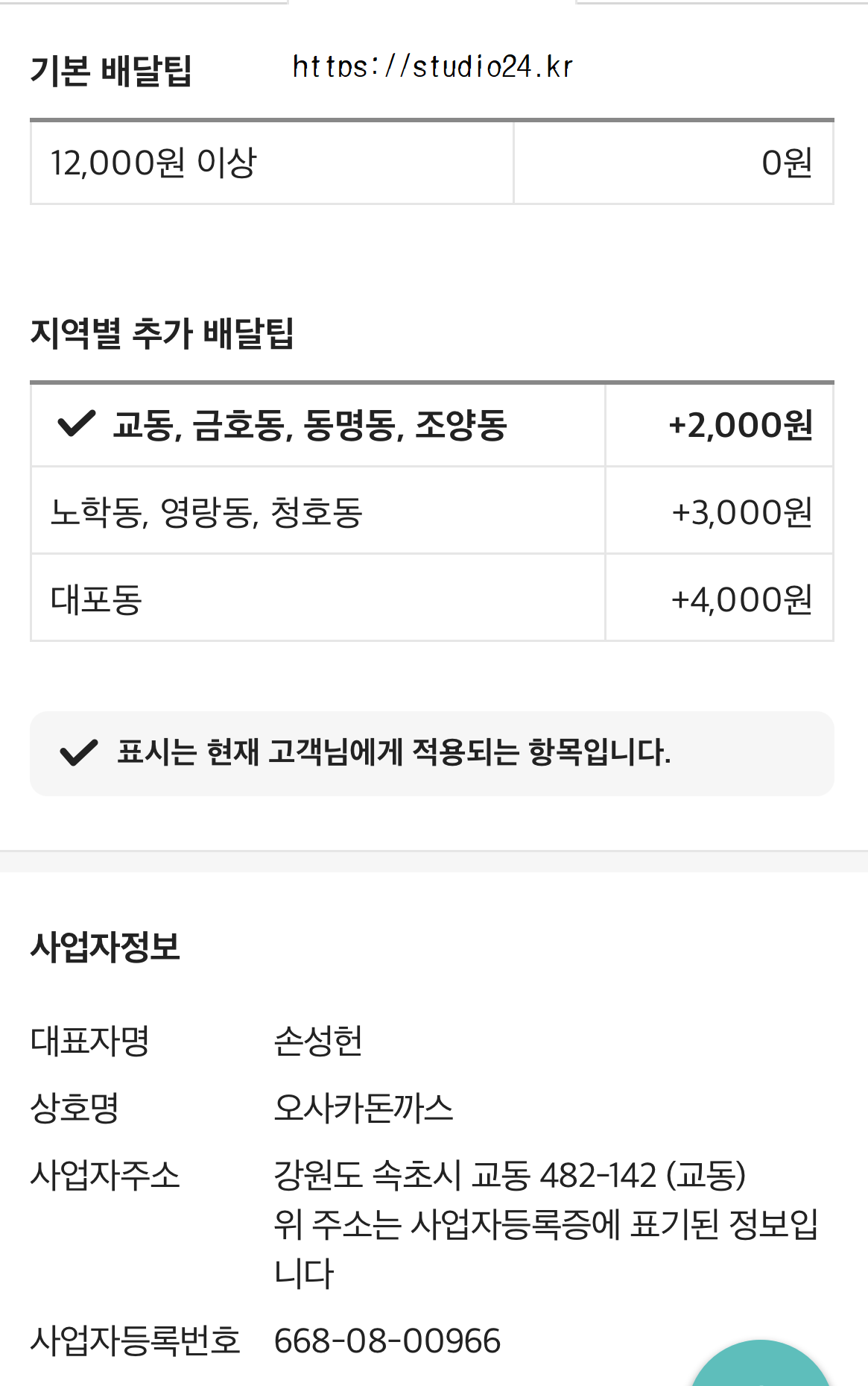 노학동, 영랑동, 청호동은 배달비 3천원이고 대포동은 4천원 추가입니다.