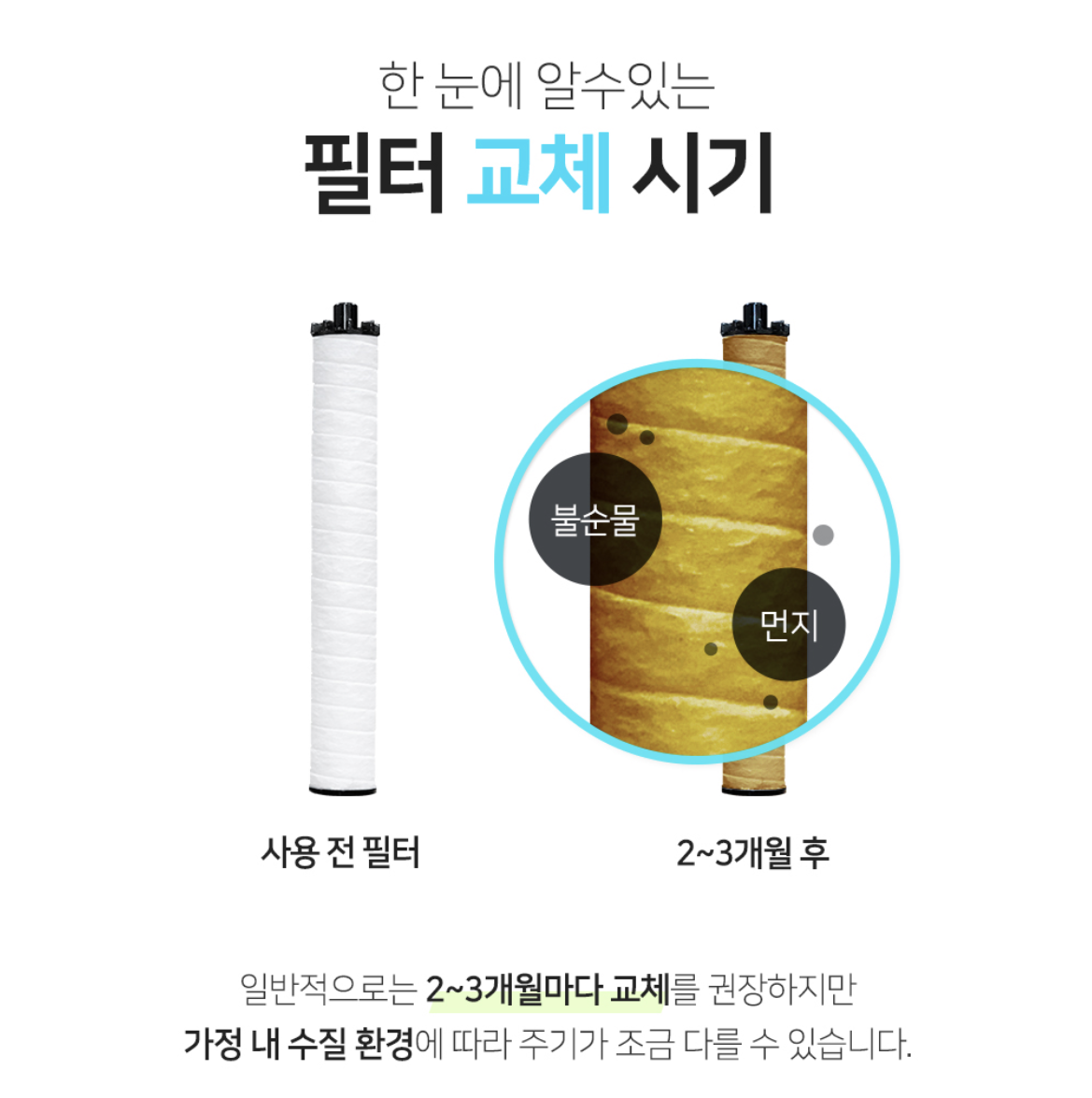 대략 2~3개월이 교체 주기로 표기되어 있지만, 가정 내 수질 환경에 따라 빨라질 수 있습니다.