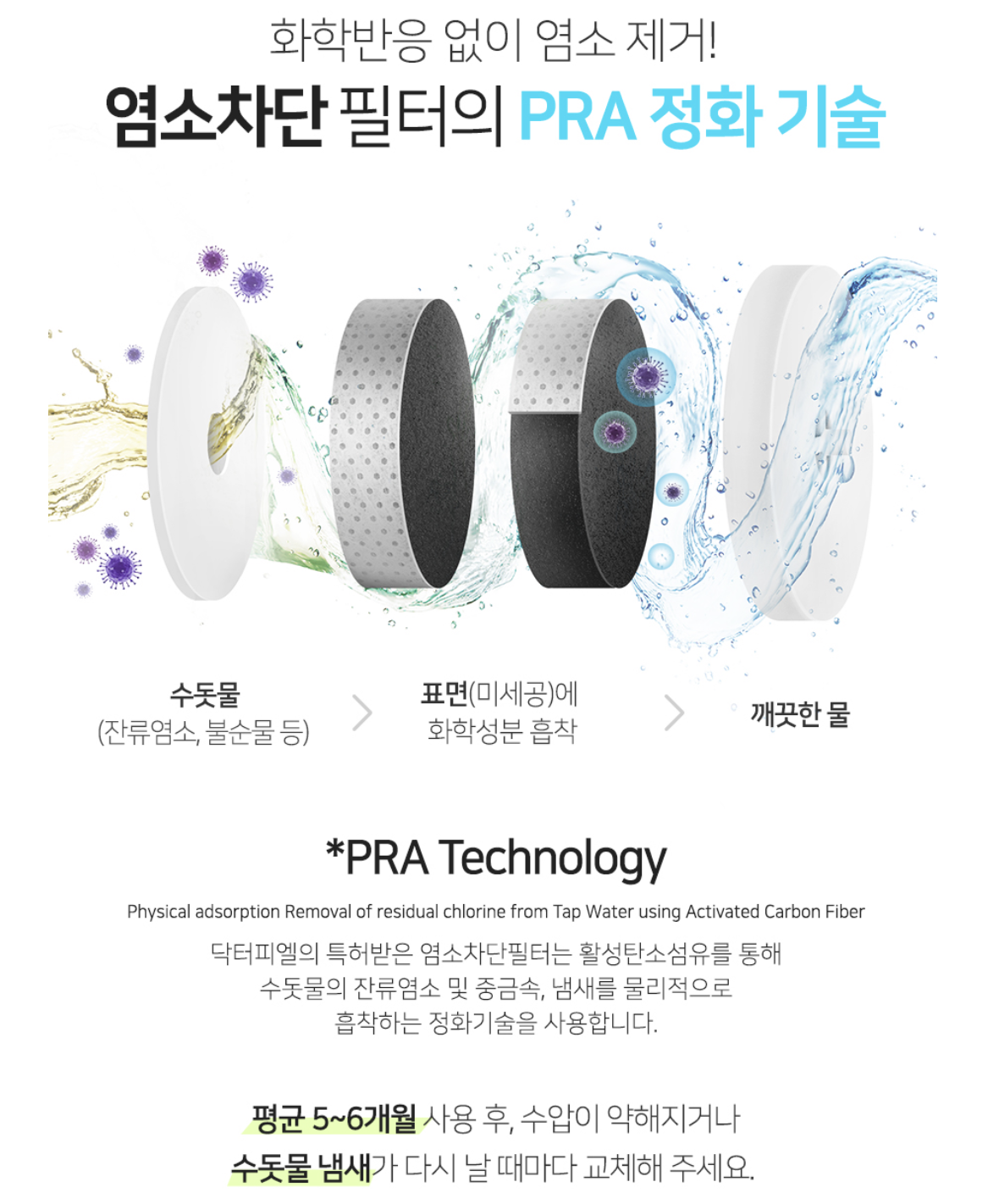 염소 차단 필터의 경우 5~6개월이 교체 주기입니다.