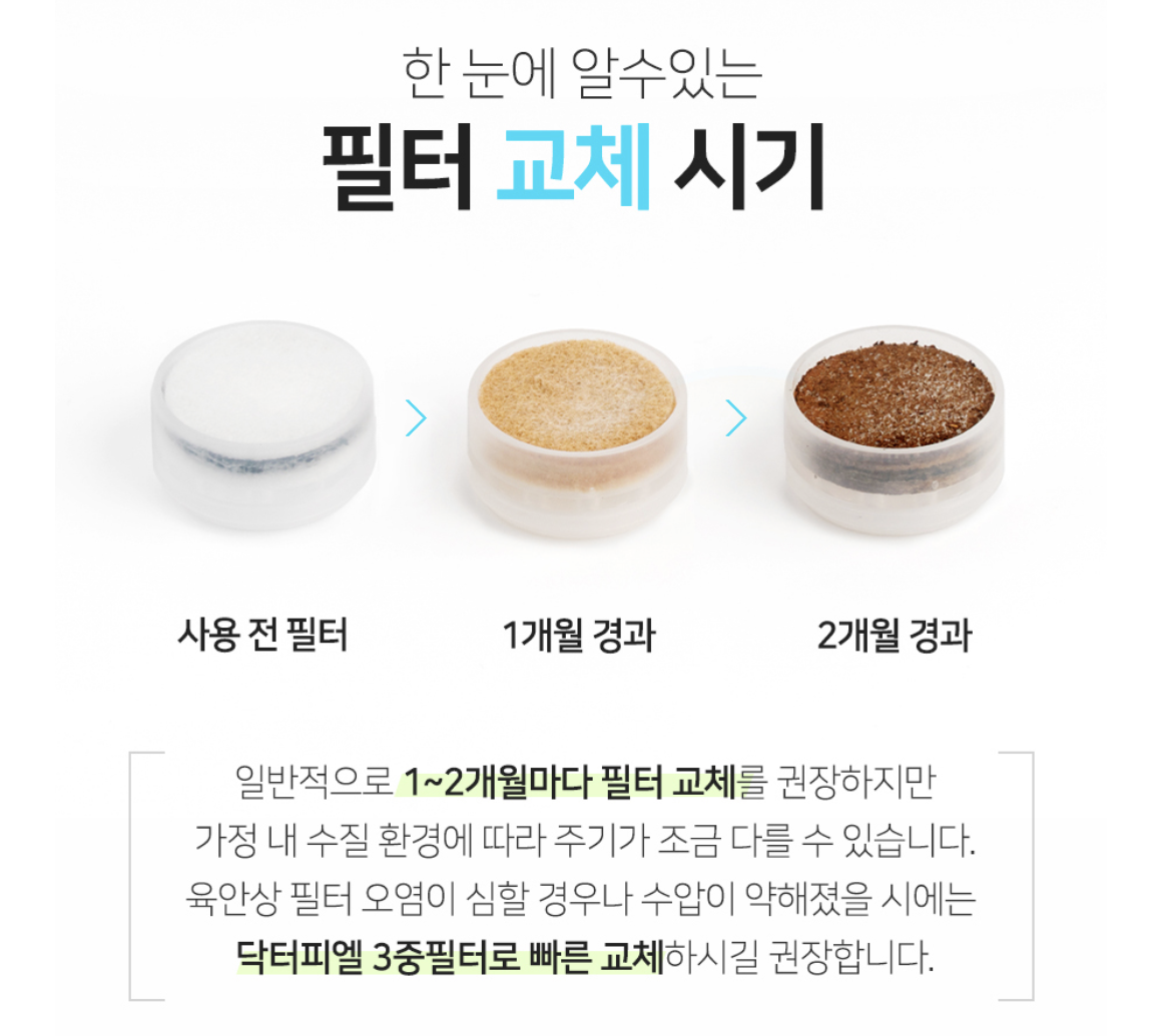 불순물 차단 필터를 한 달에 한번 교체한다고 가정한다면 3번 교체할 때 염소 차단 필터도 교체해야겠어요.