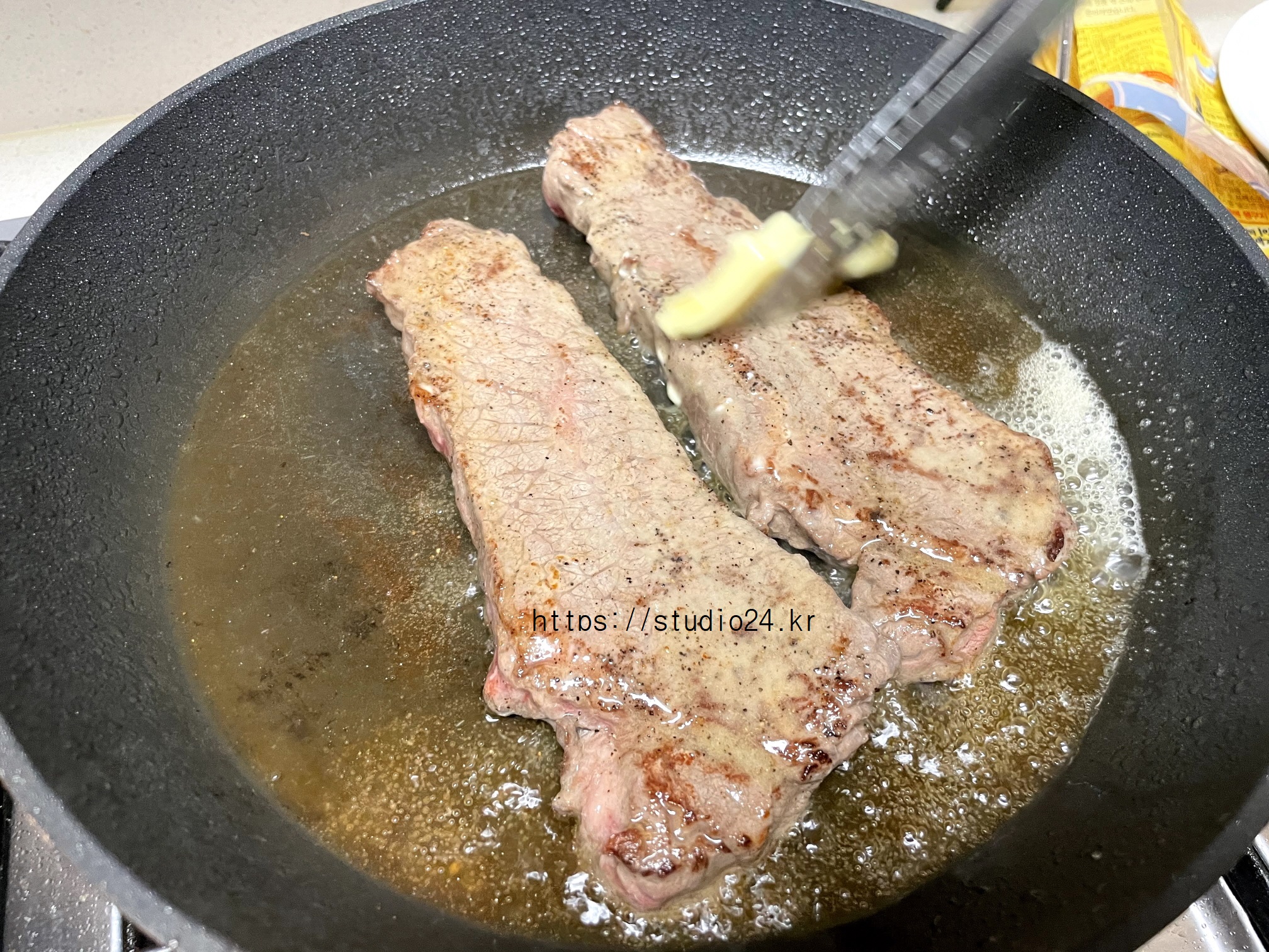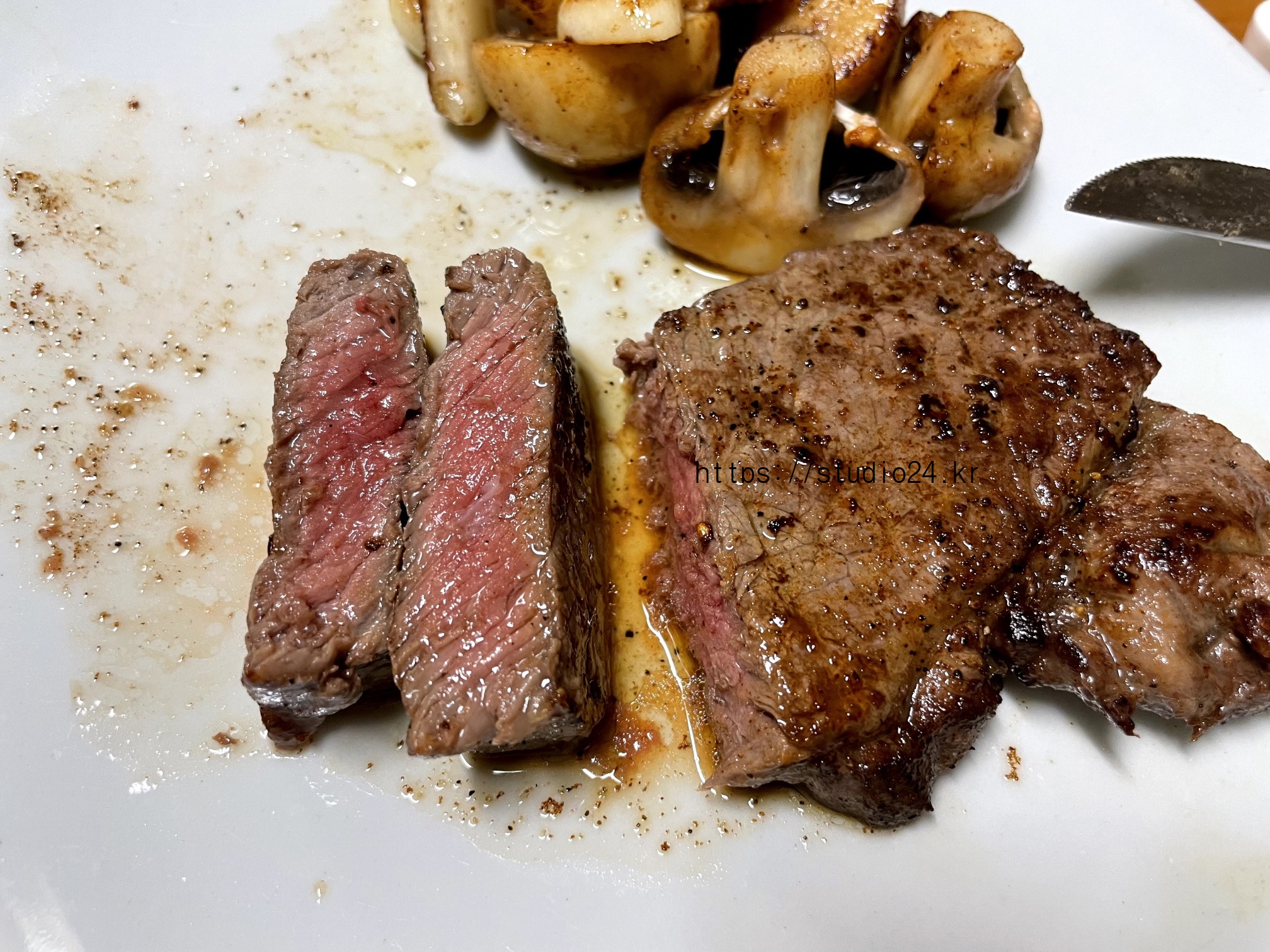 유기농 사료를 먹여서 건강한 한우로 스테이크 만들었네요.