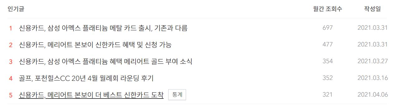 4월 등록 게시물은 22개 이고, 신용카드 관련 글들의 조회가 높았습니다.