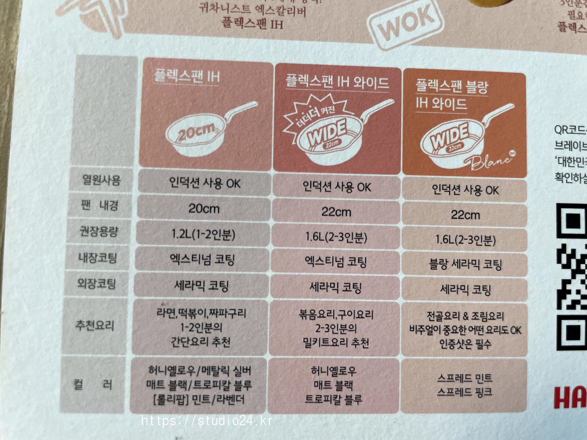어떤 코팅을 사용했고, 추천 요리까지 적혀 있어요.