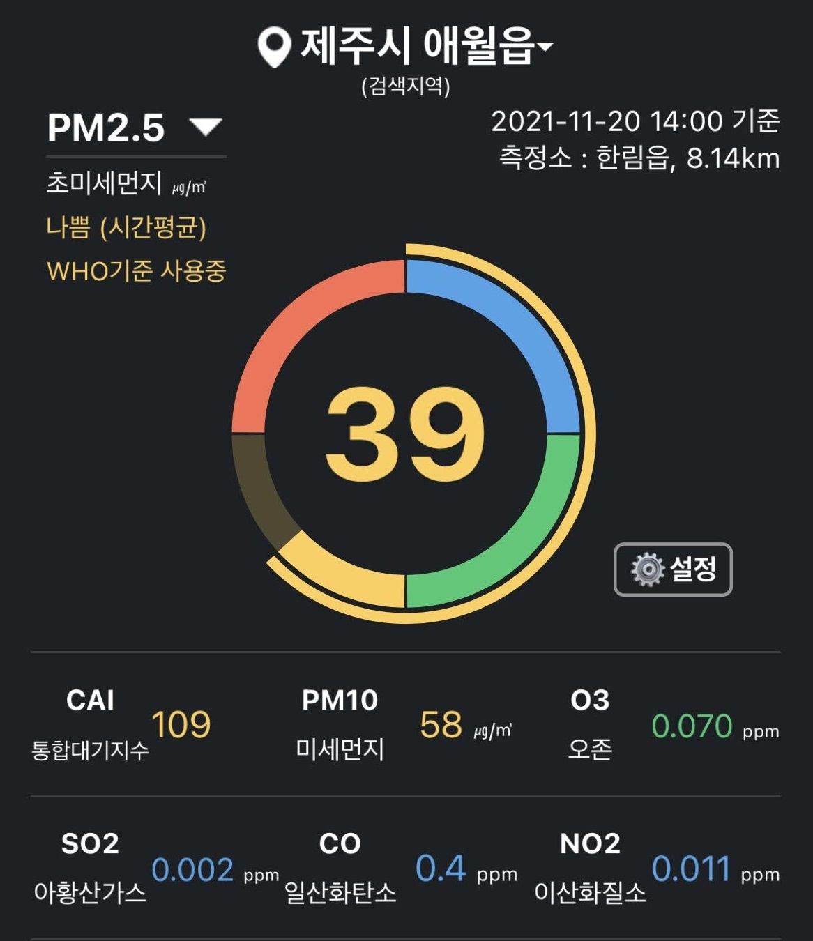 제주 애월은 PM2.5 39 / PM10 58