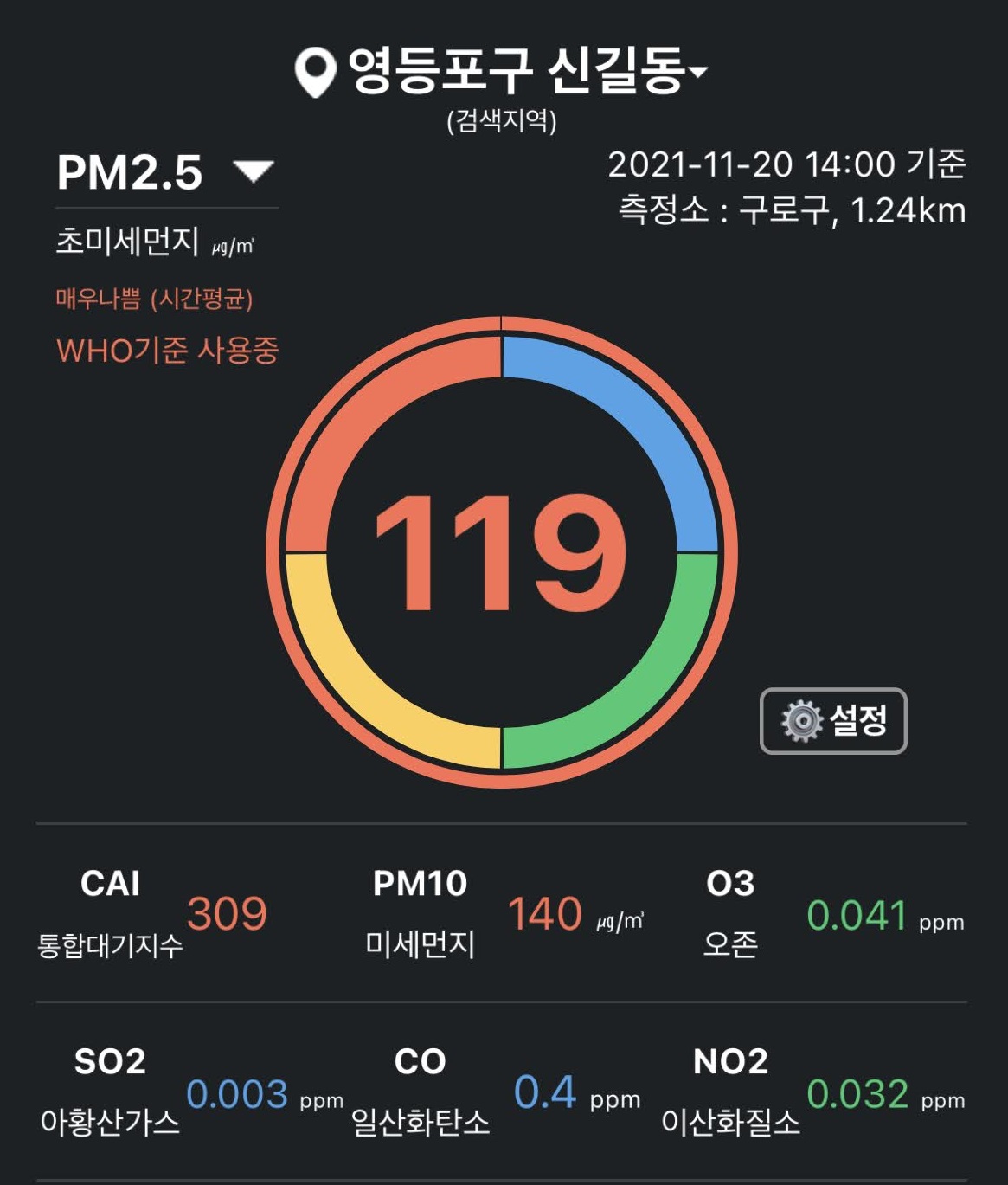 도심지, 영등포 상황 PM2.5 119 / PM10 140