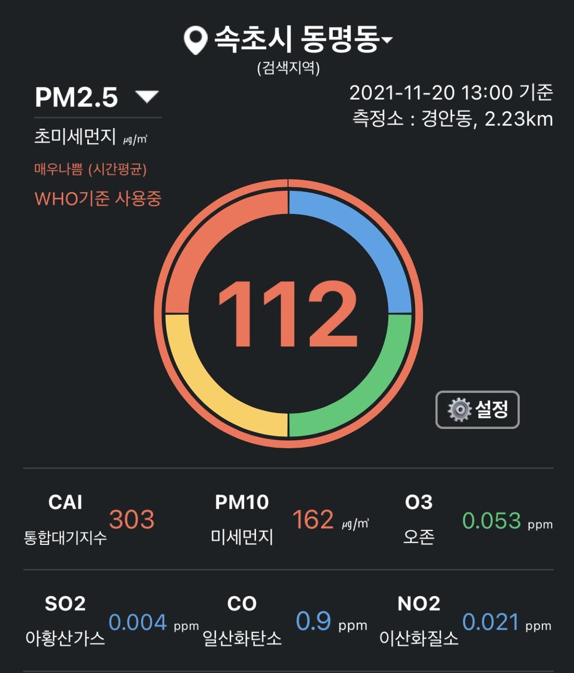 속초 상황 PM2.5 112 / PM10 162