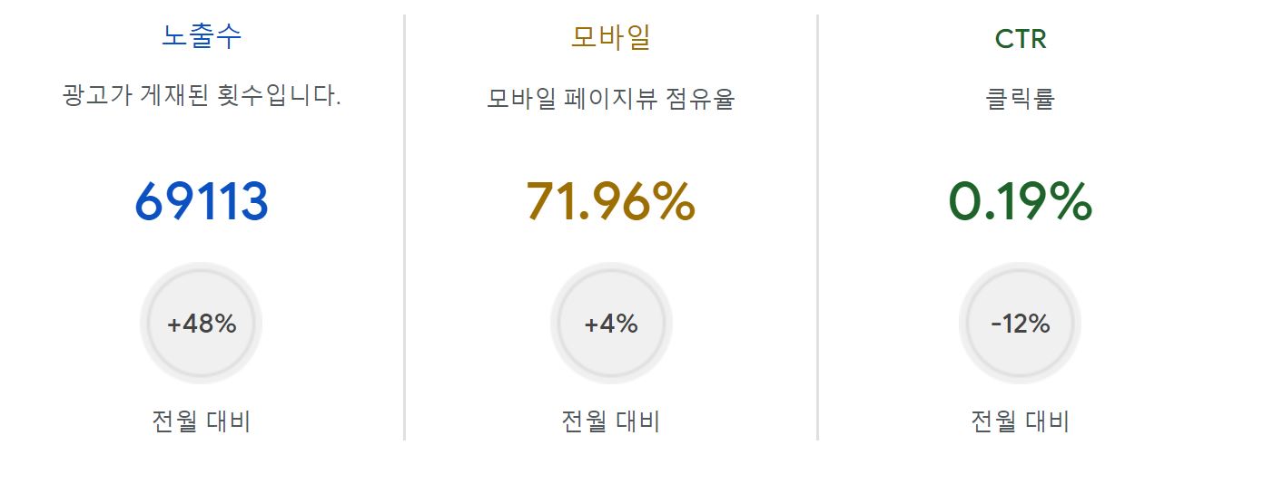 노출수 69,113건, 모바일 페이지뷰 점유율 71.96%, CTR 0.19%입니다.