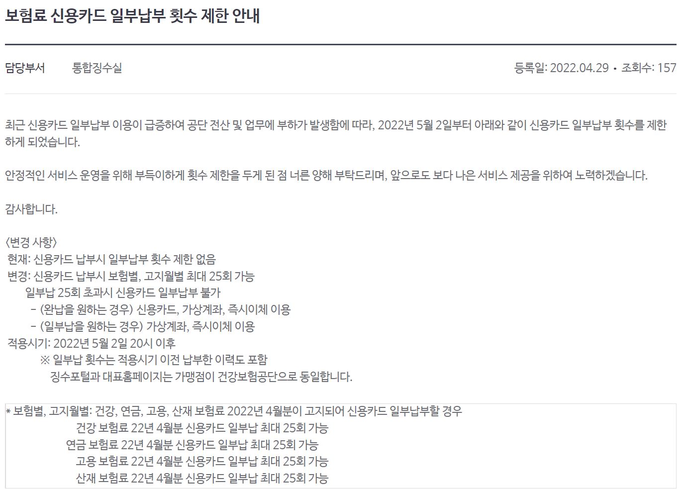 변경 전 : 신용카드 납부 횟수 제한 없음