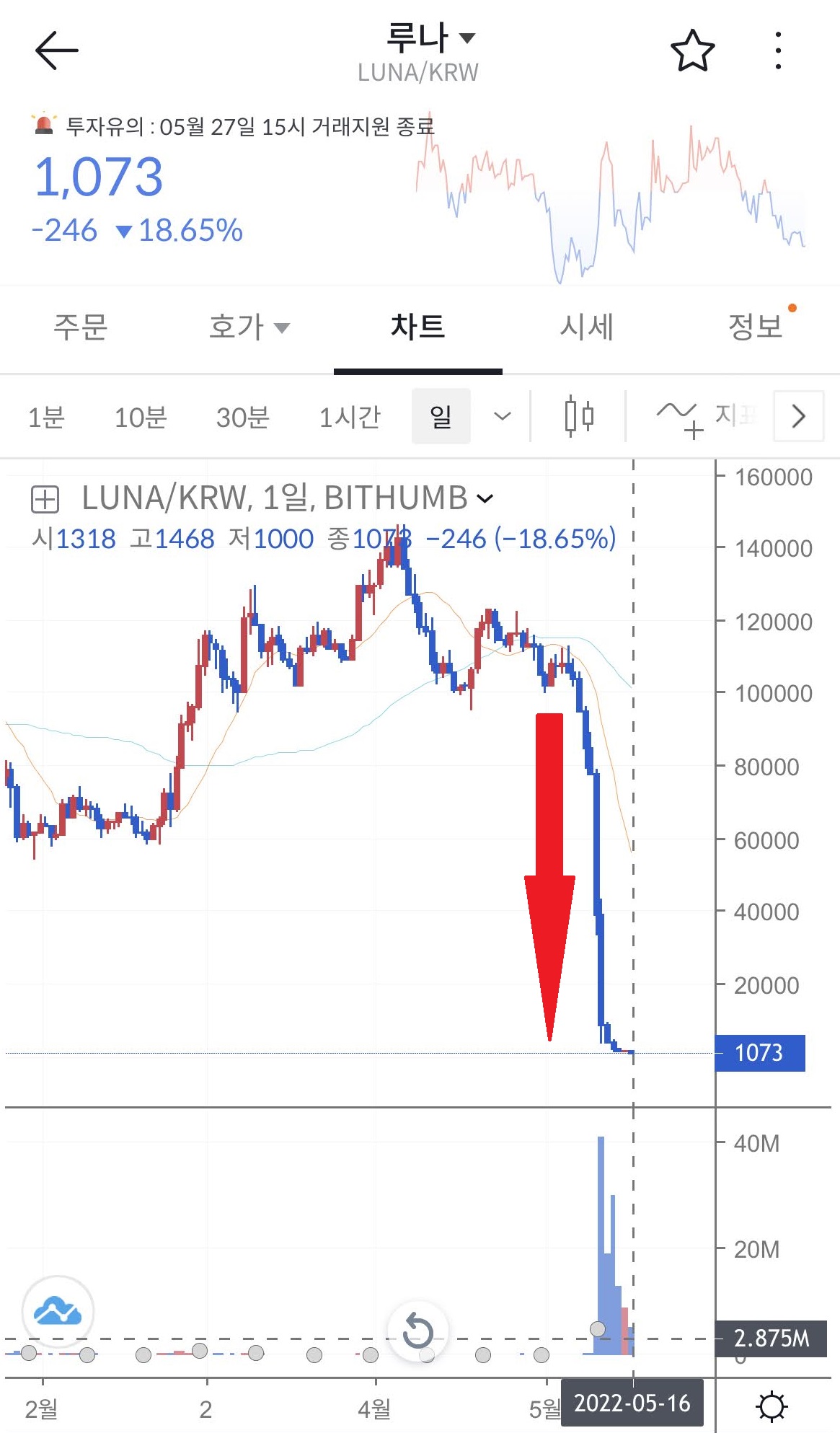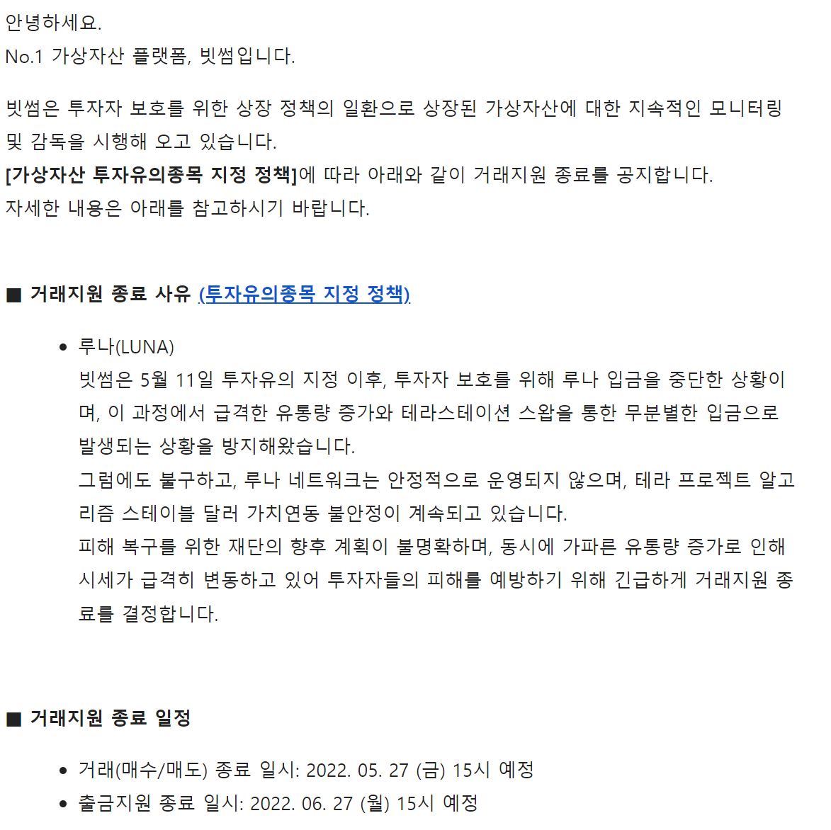 코인, 루나 코인 쇼크, 거래정지 예정