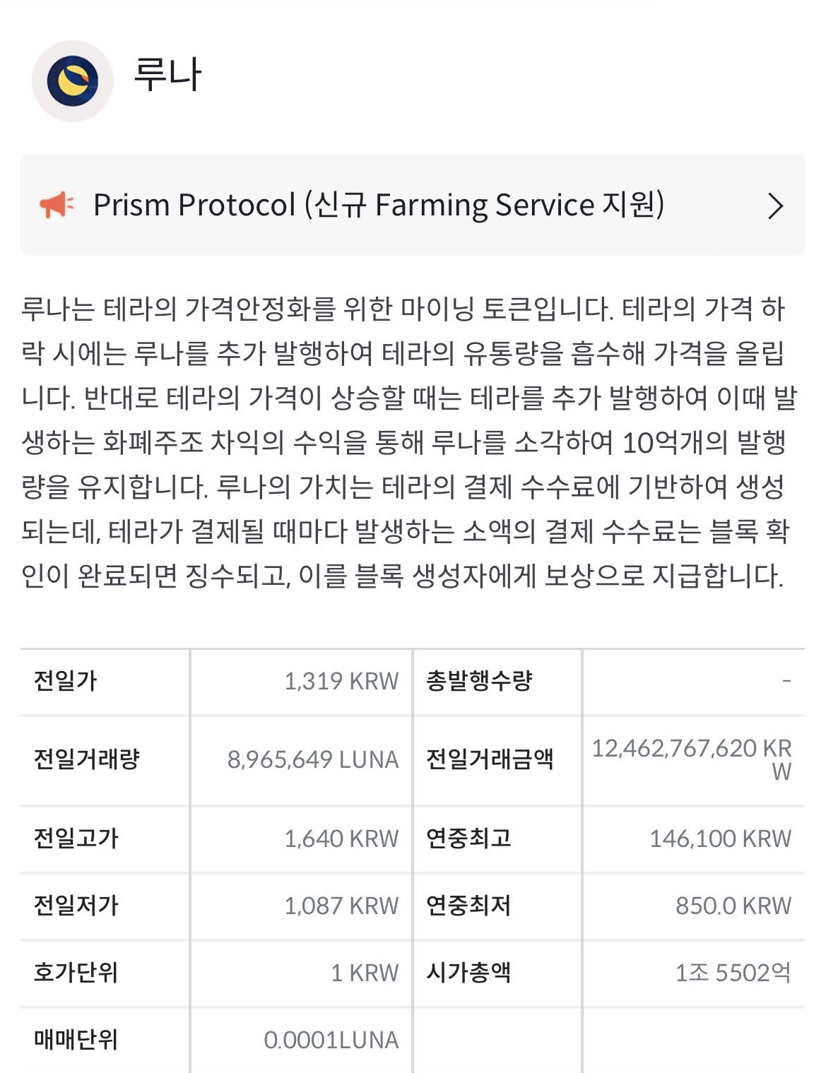 루나 코인은 가격 안정화를 위한 스테이블 코인으로 공급량을 조절하며 가격을 유지하는 시스템이라고 합니다.