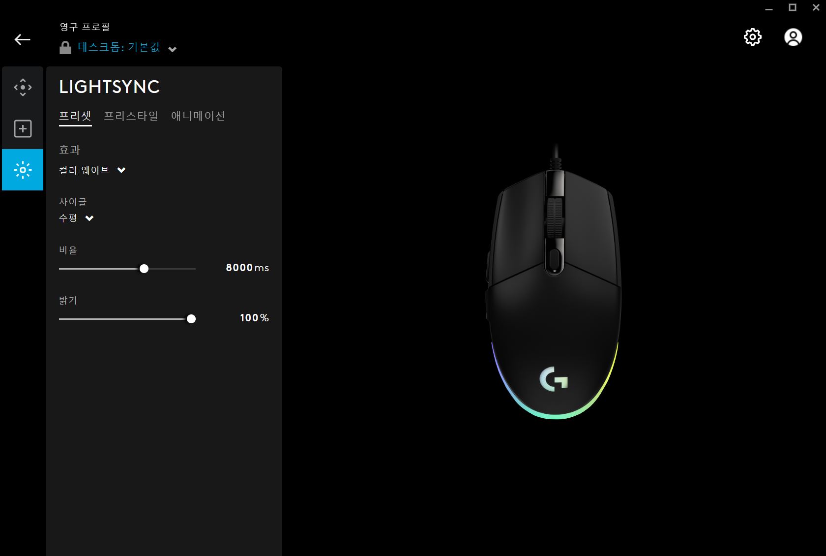크게 특성은 타지 않지만, 조명 선택을 하려면 G HUB를 설치해야 하네요.
