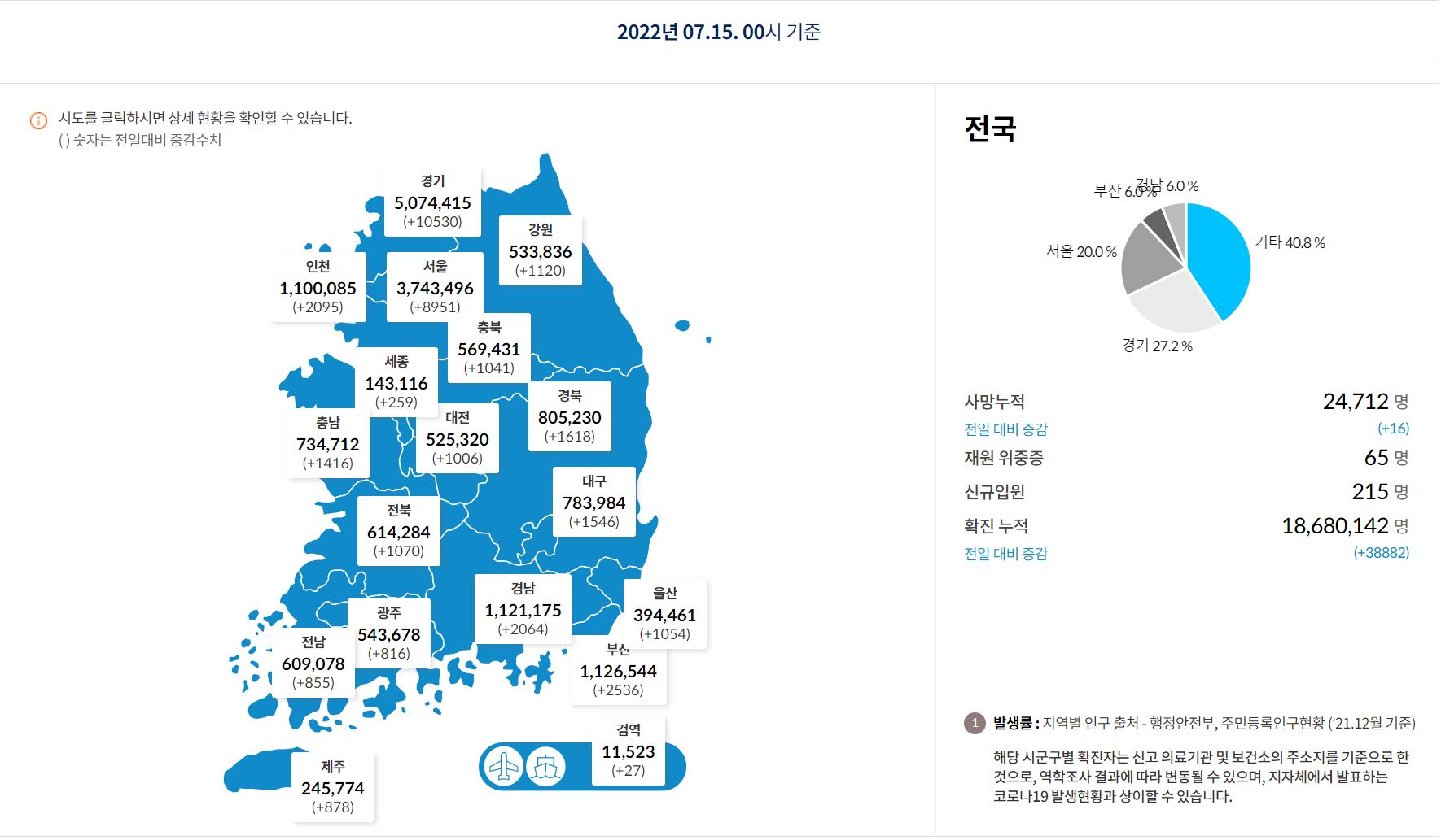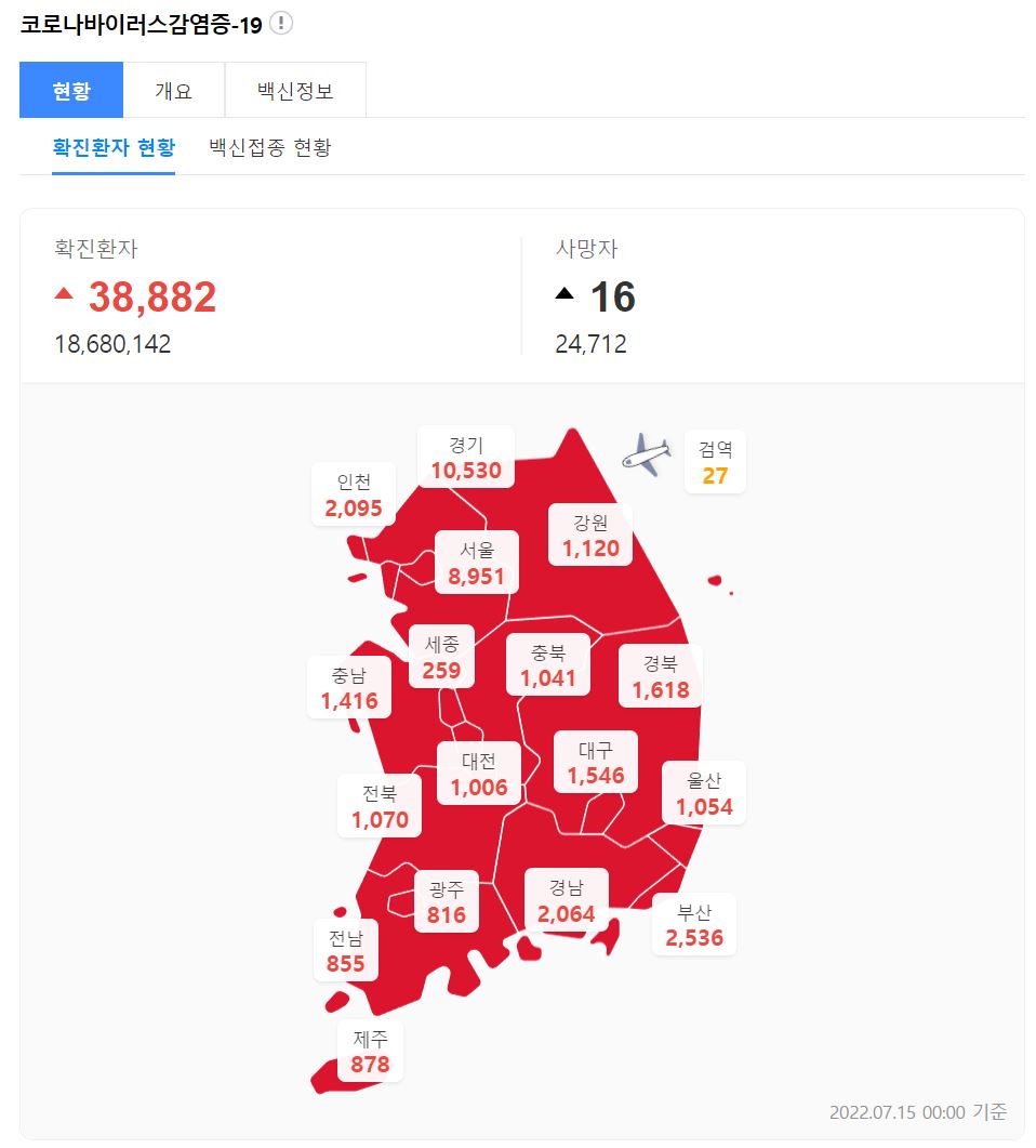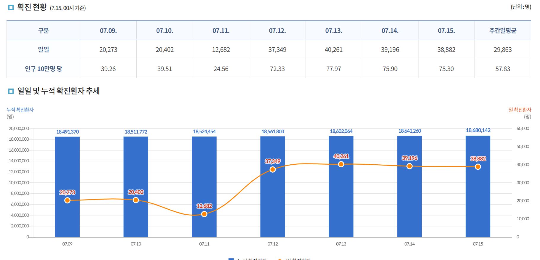 7월 15일 00시 기준 전국 확진자는 38,882명