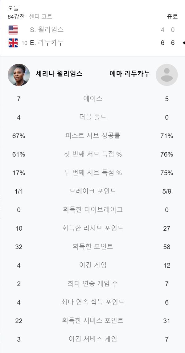 오늘의 경기는 S.윌리엄스 VS E.라두카누