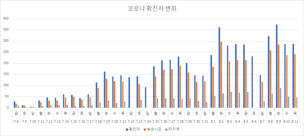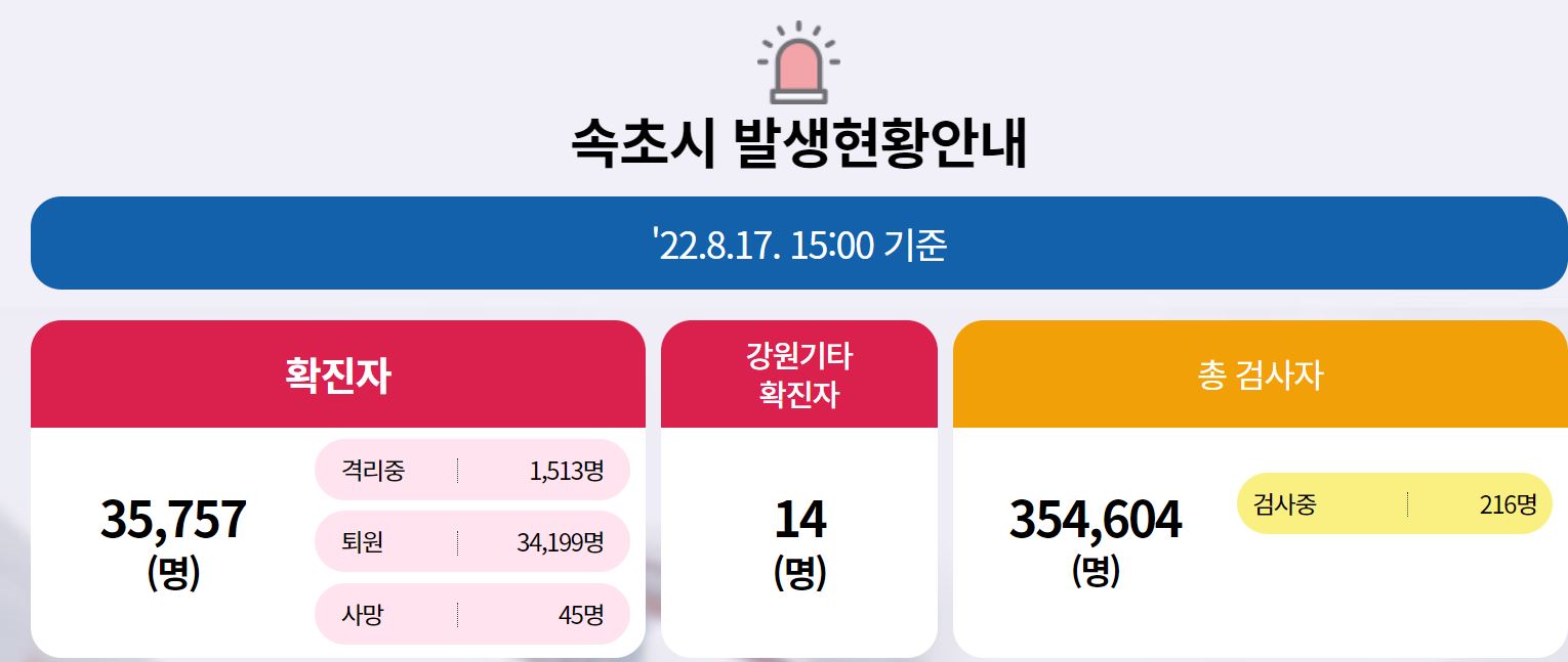 속초, 2022년 8월 16일 화요일 코로나19 확진자 319명