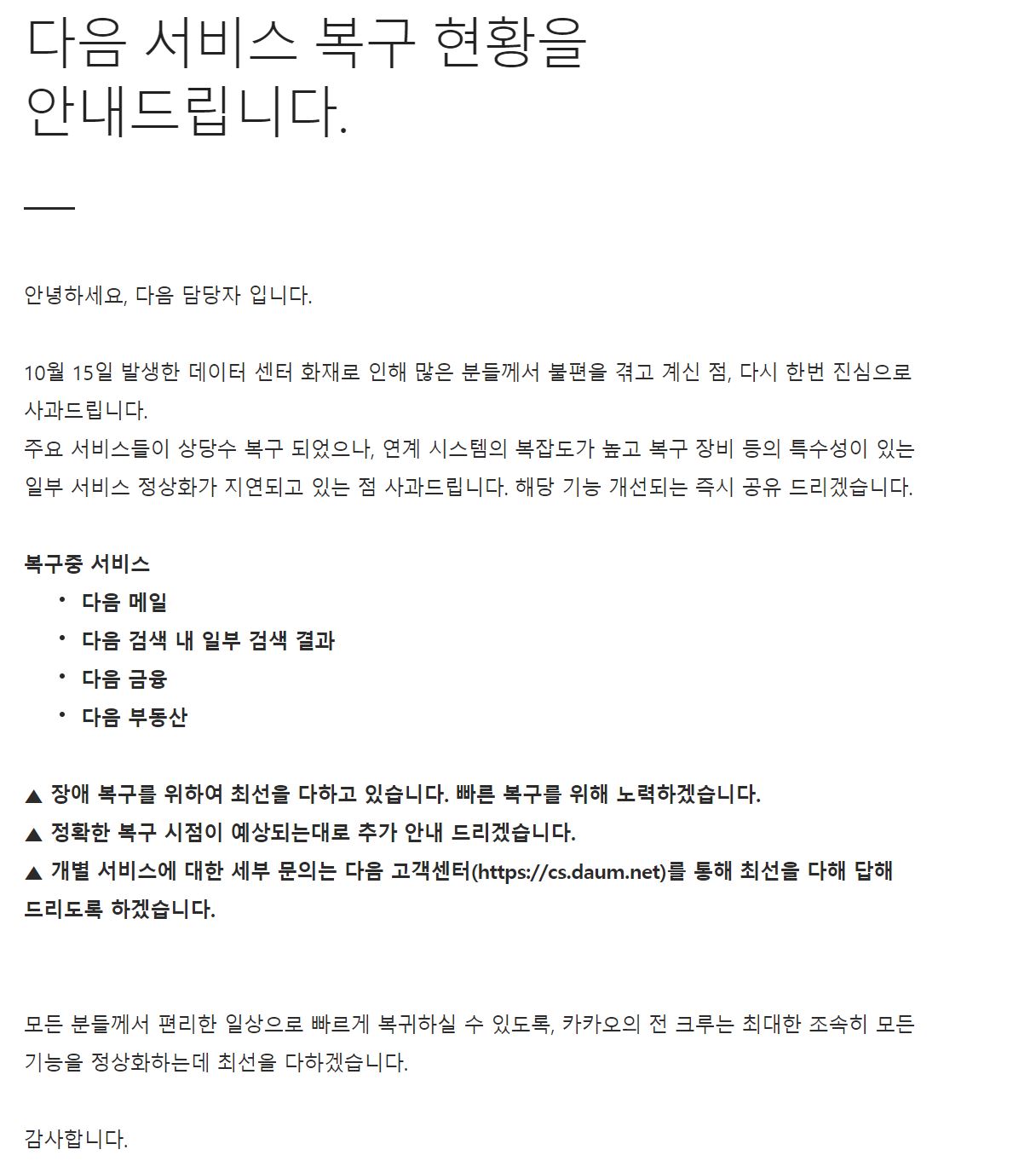 카카오가 생활 밀착형 서비스를 많이 제공하고 있고, 수익도 많음에도 불구하고 서비스 장애와 관련된 비용은 너무 아낀 거 같아요.