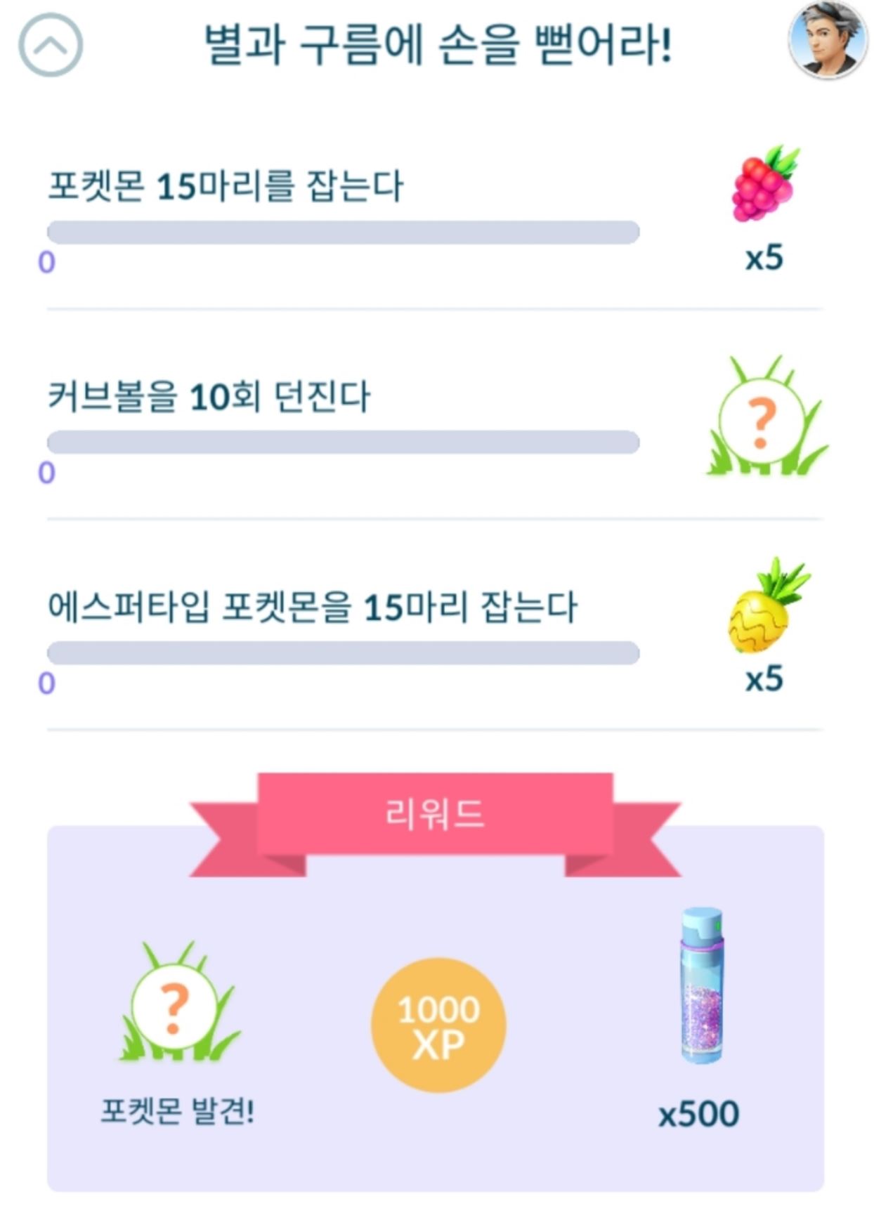 - 포켓몬 15마리를 잡는다 / 라즈열매 5개