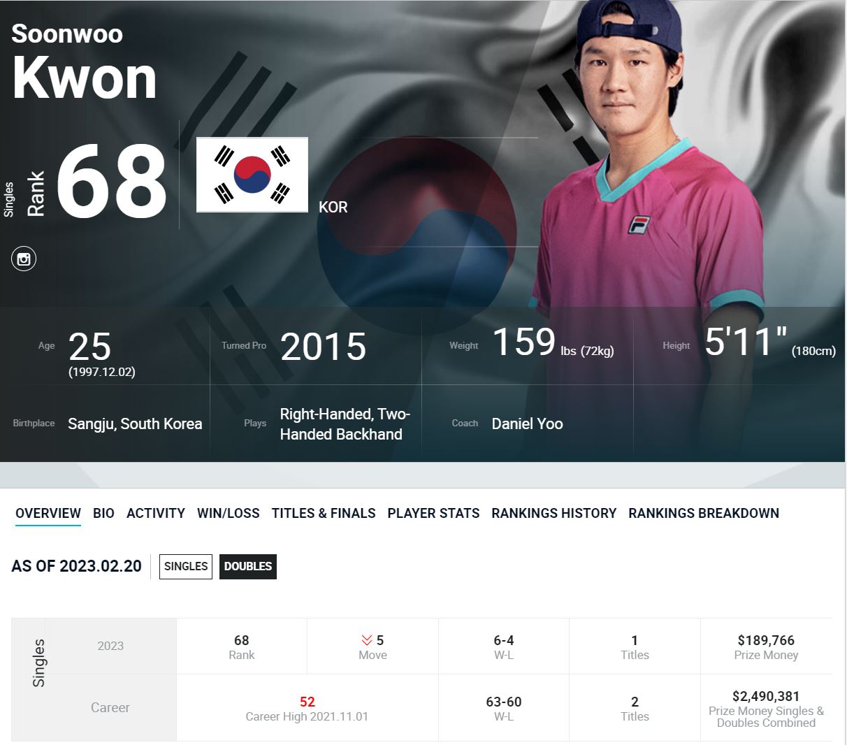 권순우 선수 (한국, 68위)