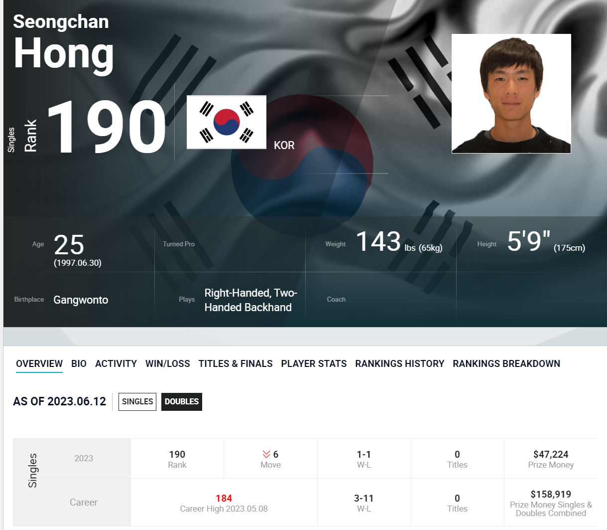 지난 4월 서울오픈챌린저 대회에서 6:4 / 6:4 로 패배한 경험이 있는 홍성찬 선수입니다.