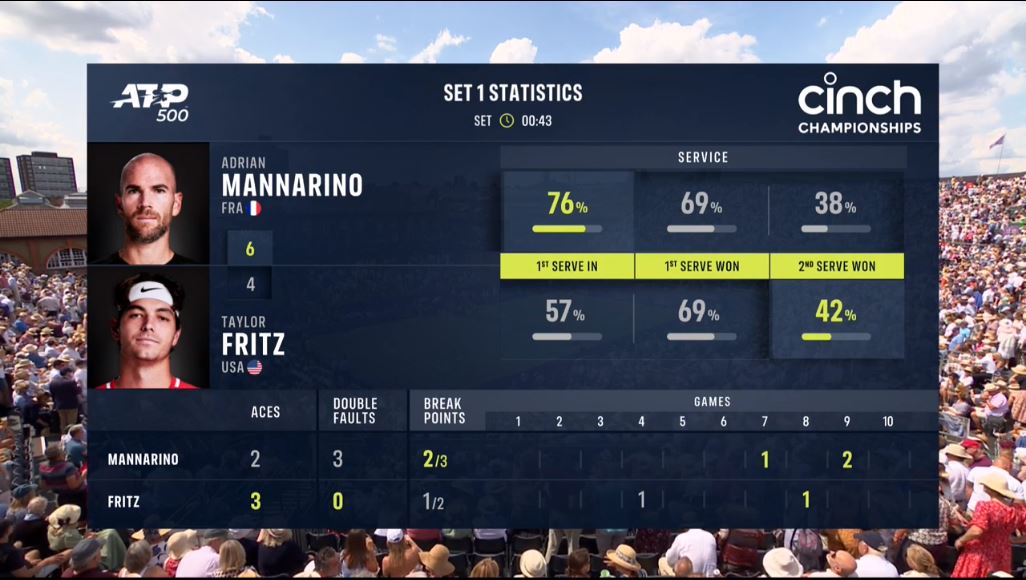 프리츠 선수가 에이스 3개로 앞서고 있고, 경기 운영도 잘했지만, 잔디 코드의 한계를 넘지 못하고 있습니다.